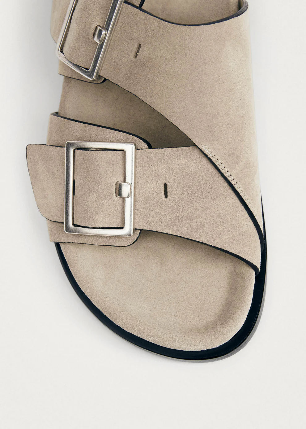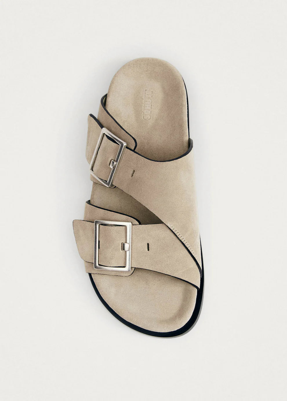 The Alohas Alba Suede Beige Leather Sandals combine style and comfort with their slip-on, backless design and wide straps. The large silver buckles not only secure the foot but also enhance the aesthetic appeal. Additionally, the tonal molded insoles offer significant cushioning, promoting all-day wearability.