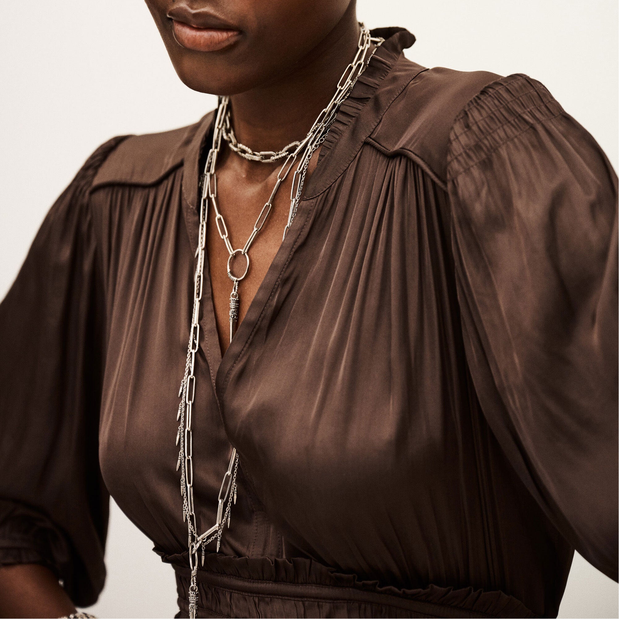 This Ba&sh Cyrilia Ruffle Mini Dress features a V-neckline, stand ruffle collar, and short gathered sleeves with elasticated cuffs for a sophisticated look. The smocked waist and tiered skirt create a flattering silhouette, made from 100% recycled polyester for a sustainable choice. In a rich brown hue, perfect for any occasion.