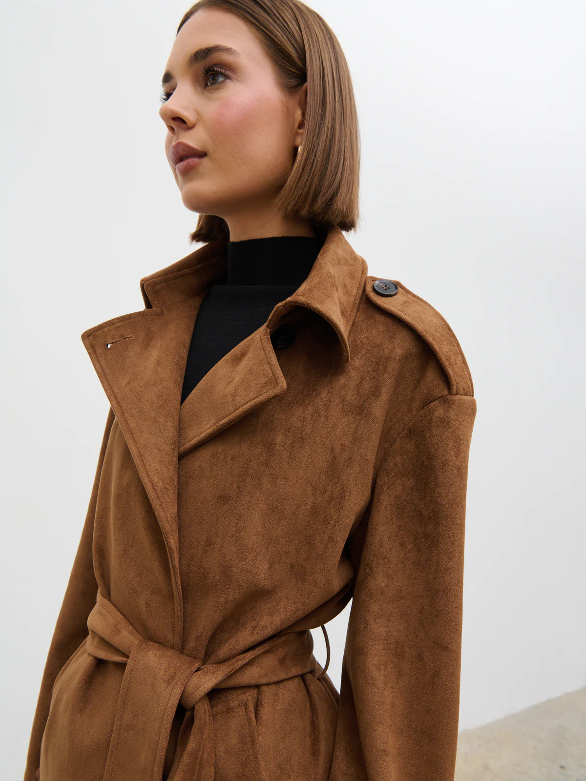 Introducing the Pretty Lavish Lennon Faux Suede Tie Waist Jacket. This tailored silhouette is made from luxurious faux suede, offering both style and comfort. The functional belt allows for defined shaping, while the epaulette detail at the shoulders adds a touch of sophistication. Complete with front pocket detailing for subtle utility. Elevate your wardrobe with this must-have jacket.