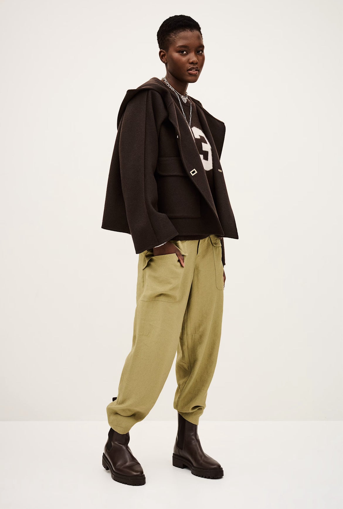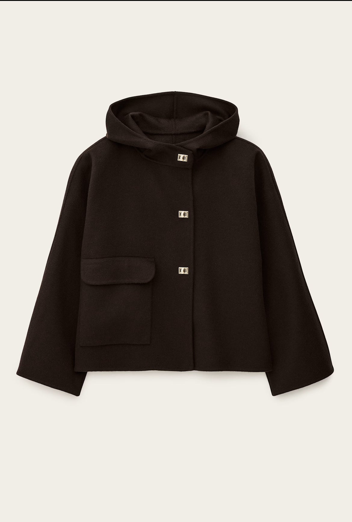 - Cropped style- Loose, straight cut- Double fastening with metal hook- Hood- Wide collar- Large flap pocket