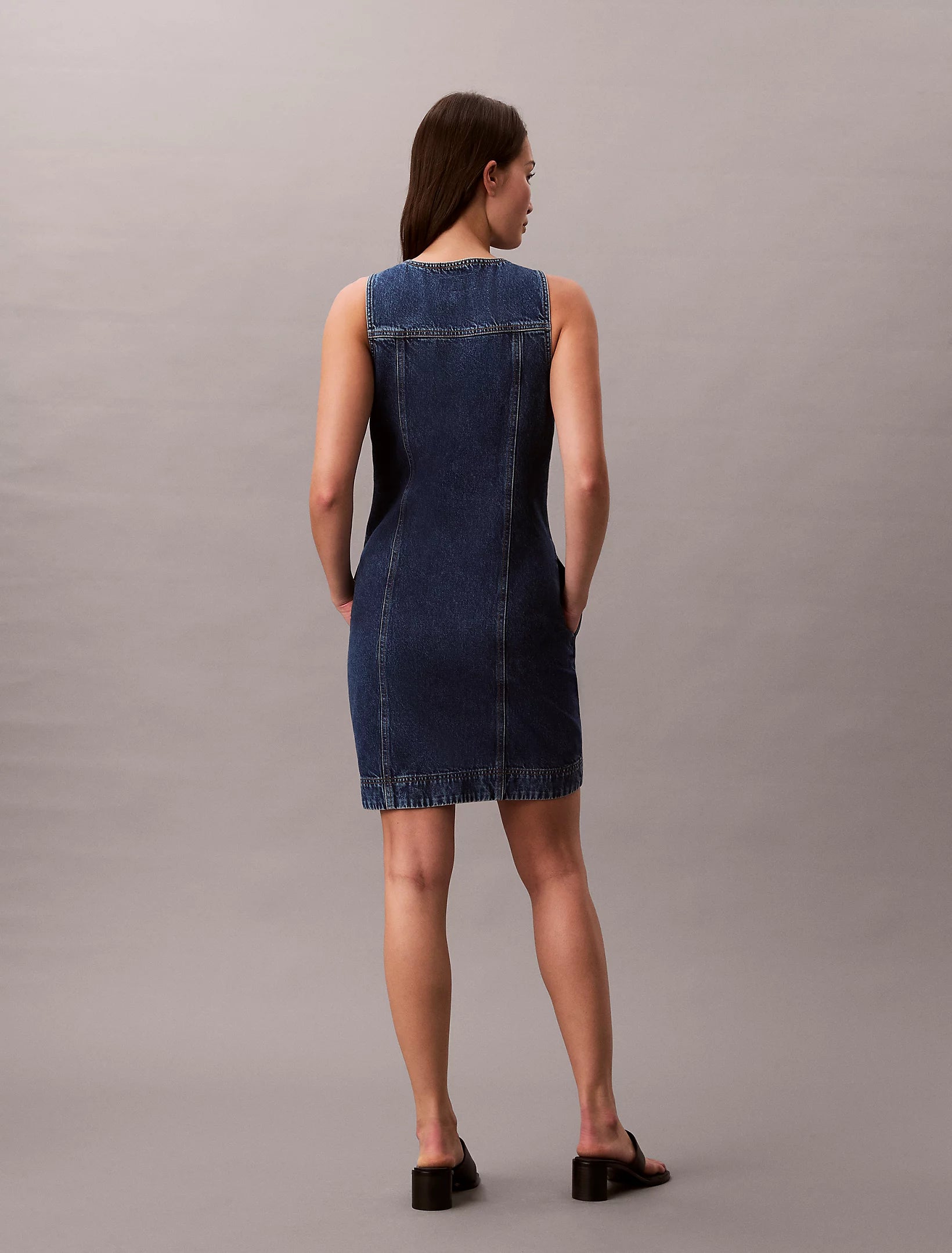 The Calvin Klein Sleeveless Denim Trucker Dress, crafted from pure cotton denim, features a button-through front, flap chest pockets, and side seam pockets. Its dark blue stonewash finish and branded hardware enhance durability while providing a versatile addition to modern wardrobes, adaptable to various styles and occasions.