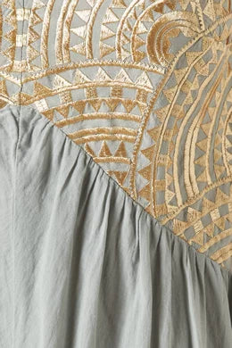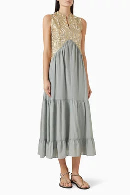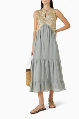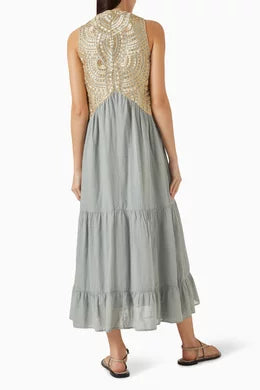 Greek Archaic Kori’s dress features a sleeveless embroidered bodice and a flowing, tiered skirt. Designed for ease and movement, this piece combines artisanal detailing with a relaxed, feminine silhouette.