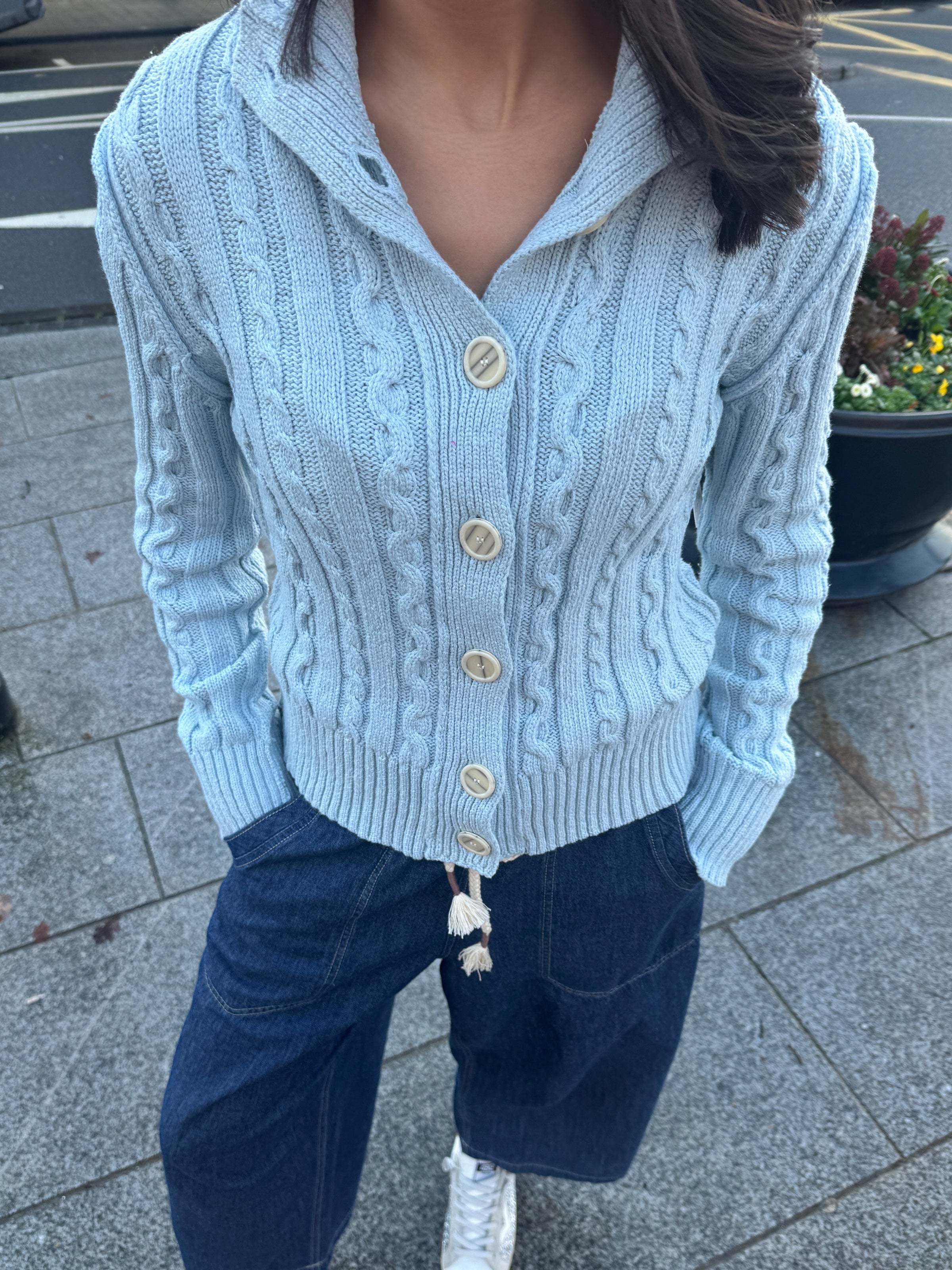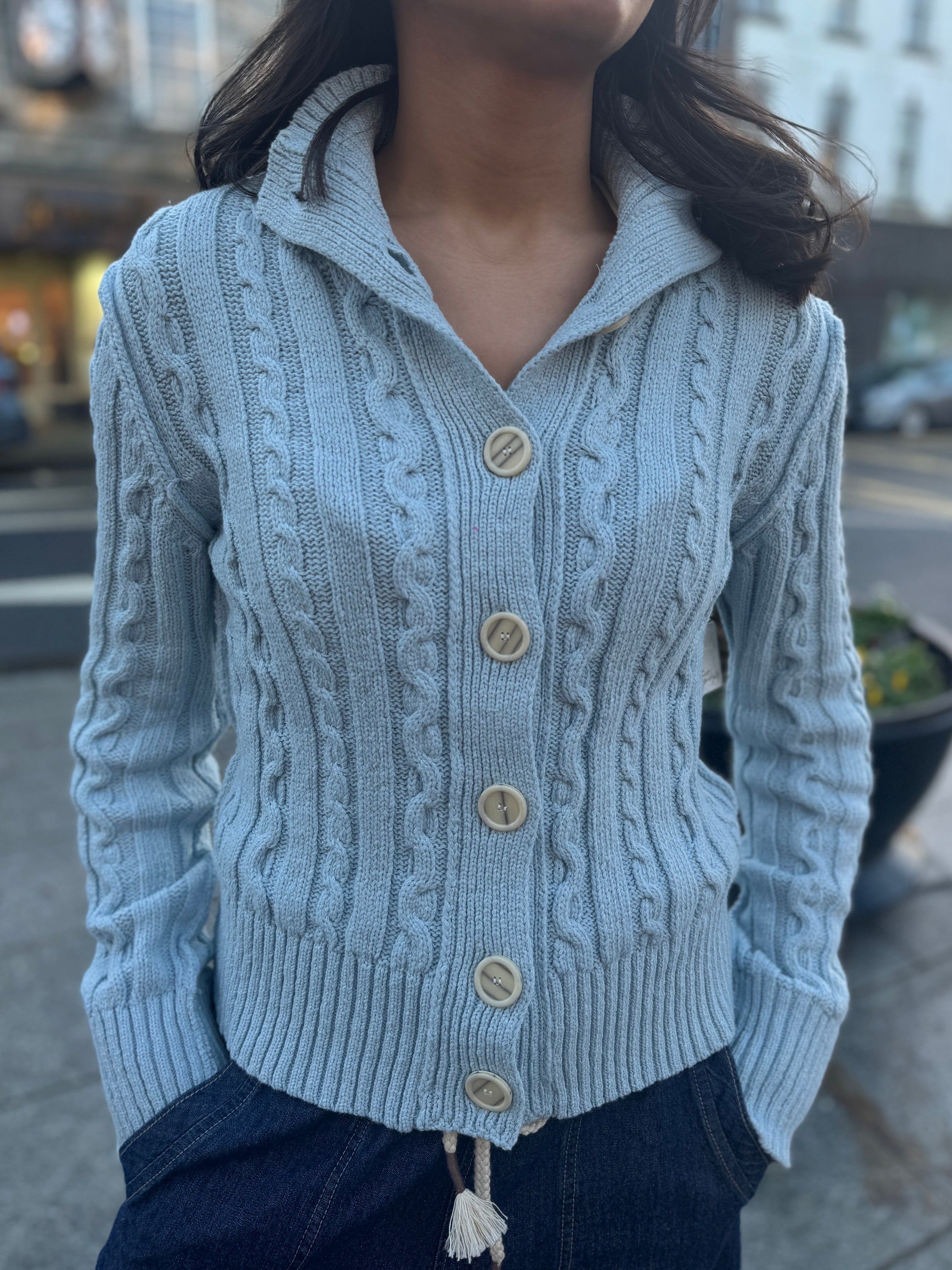 The Free People cardigan features a blue aaron style design, offering a blend of warmth and contemporary fashion. Crafted from high-quality materials, this cardigan provides comfort and durability, making it suitable for various occasions. Its versatile color enhances layering options, complementing multiple outfits effortlessly.