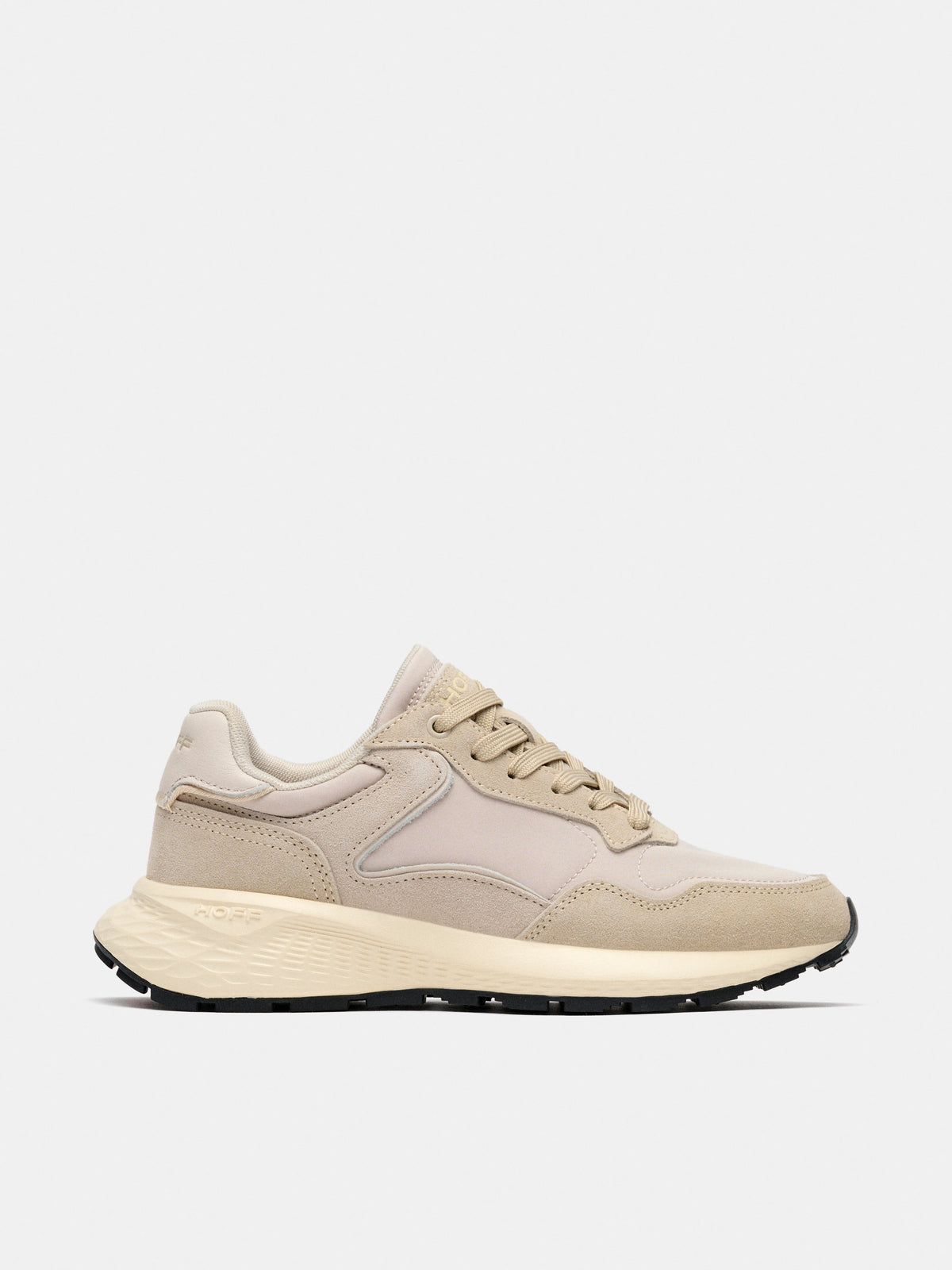 The Hoff sneaker combines a diverse array of materials and colors for a unique aesthetic appeal. Its waffle sole enhances traction, providing stability during movement. The lace-up fastening ensures a secure fit, supporting comfort and performance in various activities.