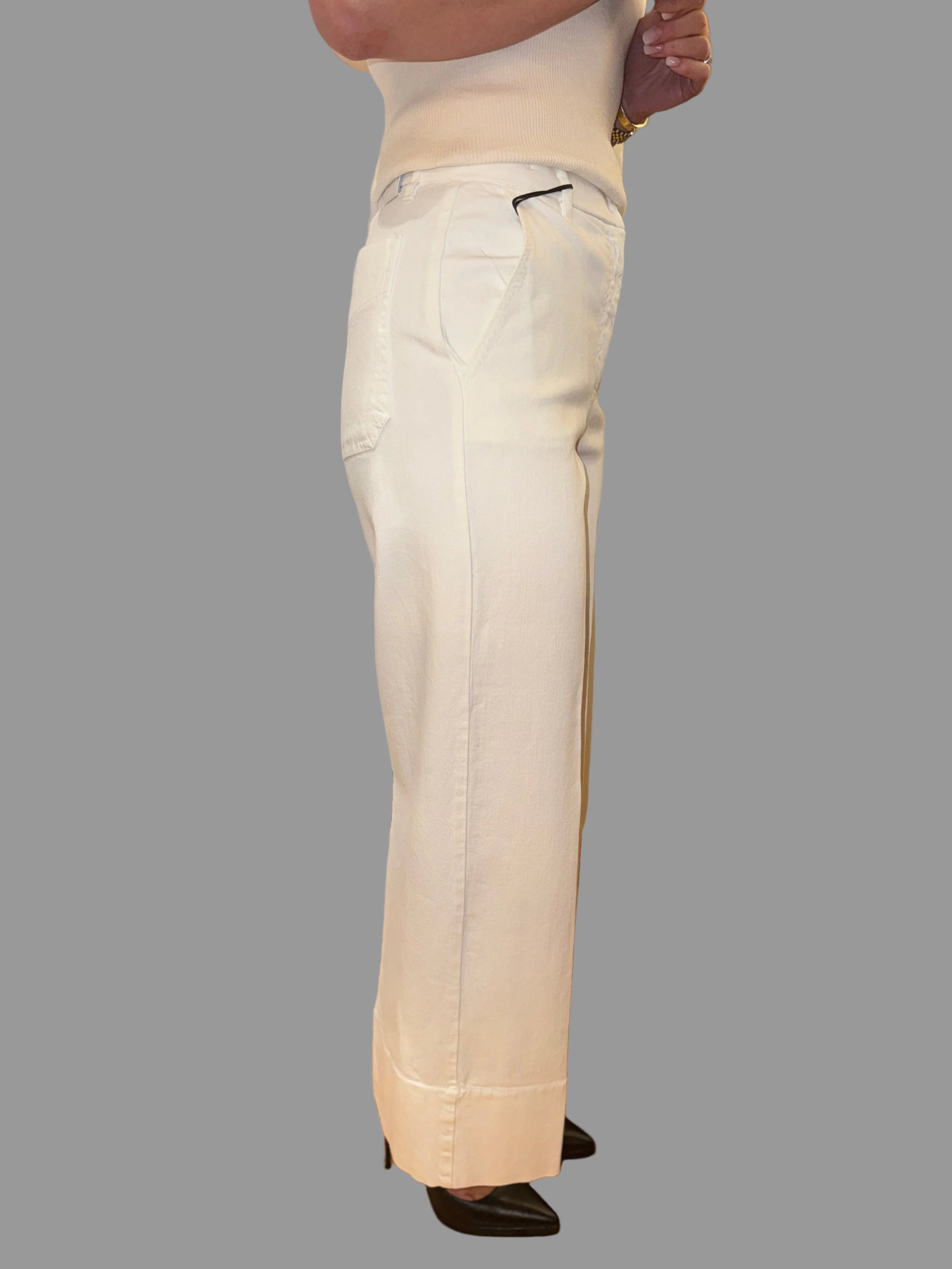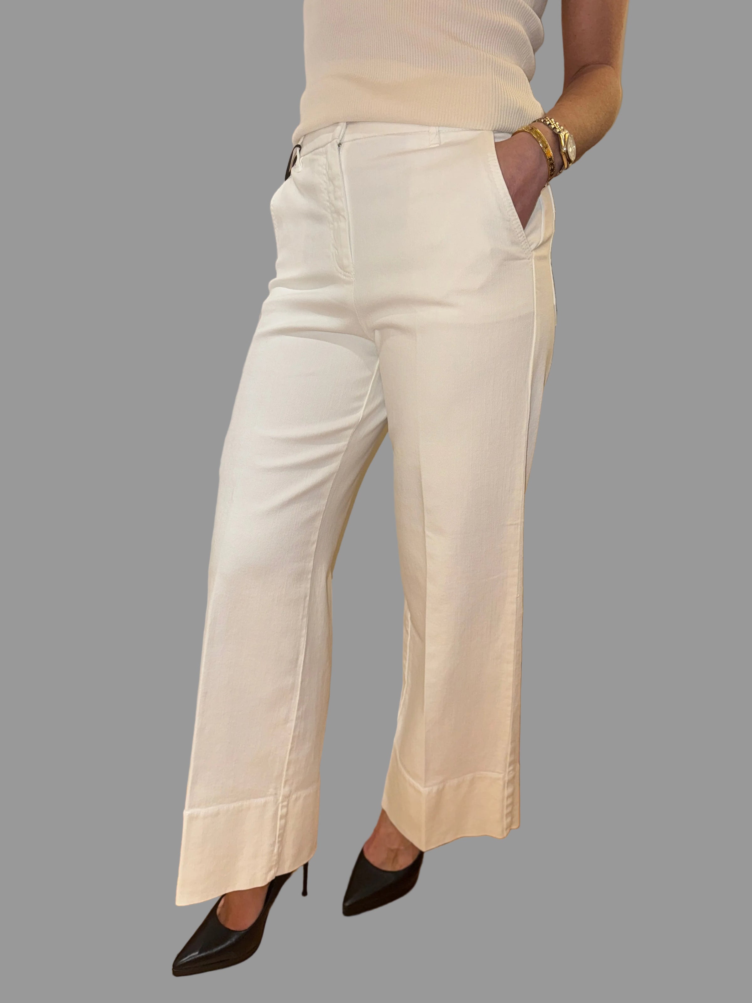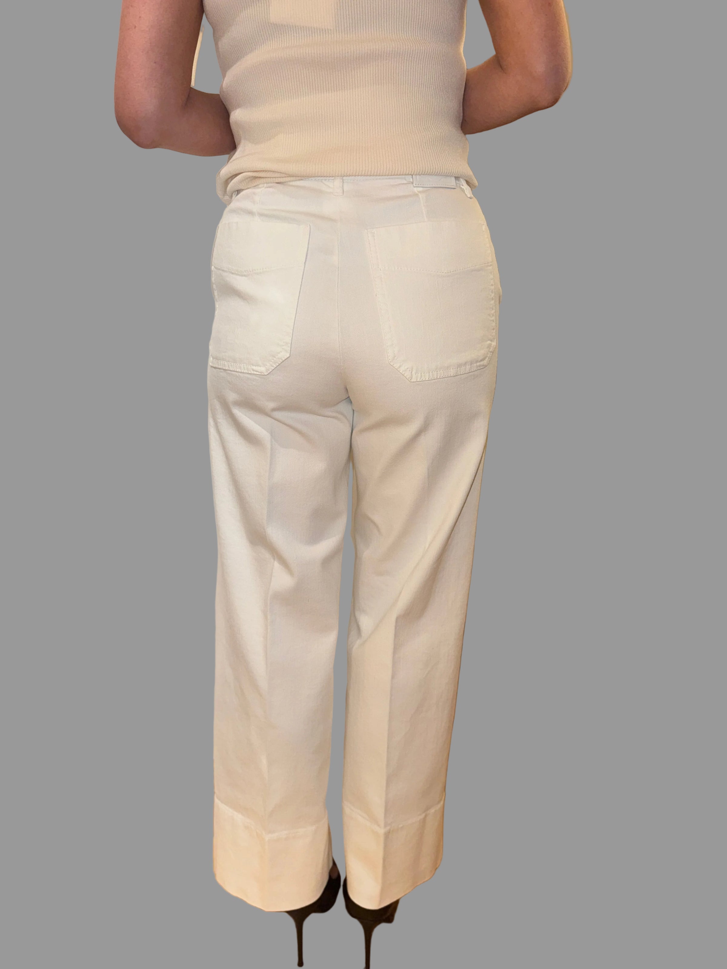 Introducing the Marella White Jean, featuring a thick turn up at the bottom and button closure for a stylish and secure fit. Crafted from high-quality materials, these jeans offer both comfort and fashion. Upgrade your wardrobe with these must-have jeans.