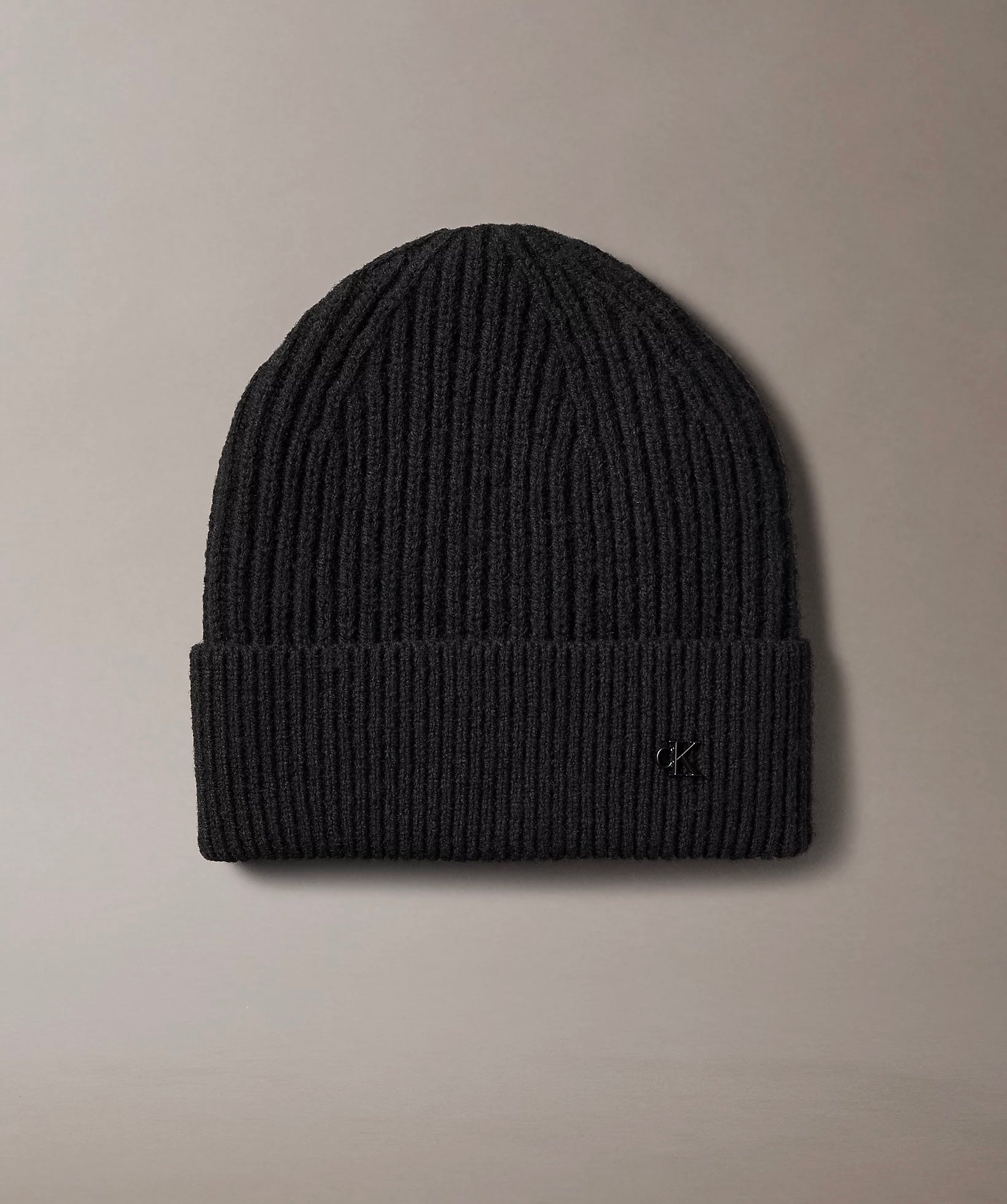 This Calvin Klein beanie is a must-have for cooler weather. Made with a soft and warm wool blend, its ribbed knit adds comfort and style. The Calvin Klein monogram logo hardware on the cuff gives it a refined touch. Stay cozy and on-trend with this essential accessory.