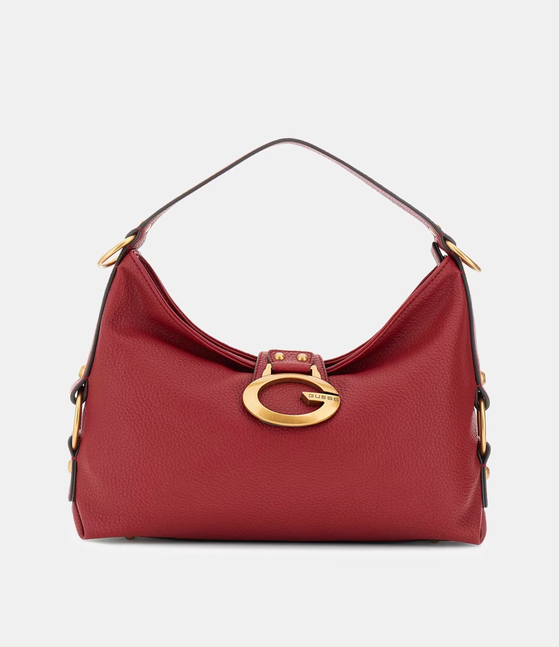 Expertly crafted with a faux leather outer, the Guess Camden shoulder bag in Red is the perfect combination of style and functionality. This bag features a secure zip closure and gold hardware for a touch of sophistication. The personalised logo lining and metal detailing add a luxurious touch, while the internal zip pocket provides convenient storage. Make a statement with the metal logo-script detail on the front.