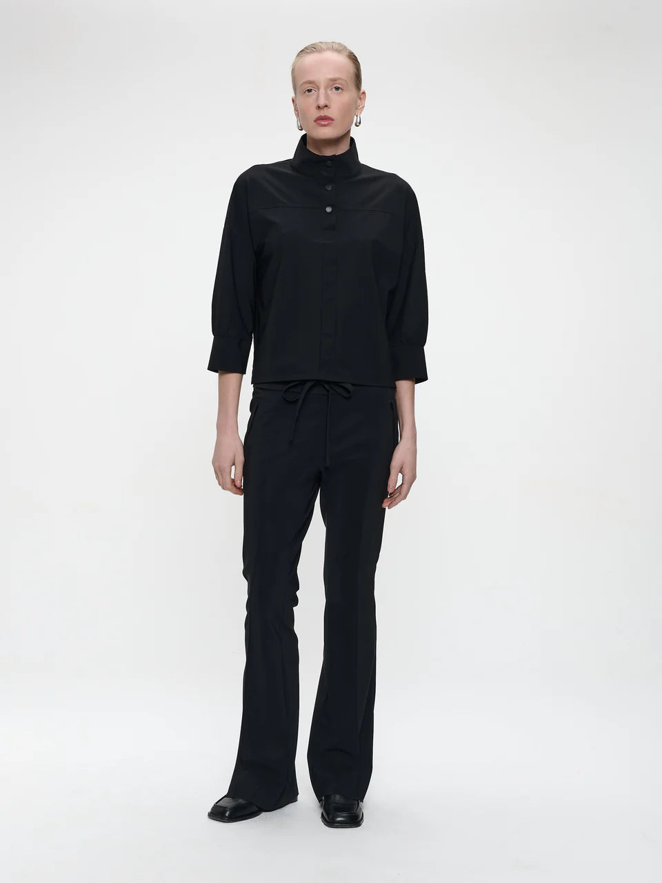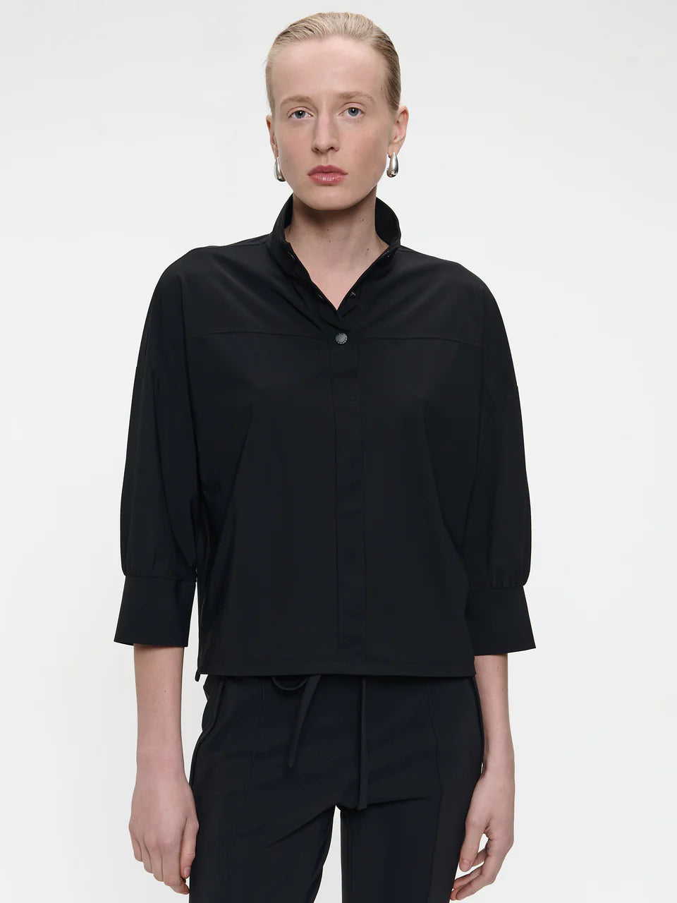 Elevate your wardrobe with the Jane Lushka Angelina Top Technical Jersey. Crafted from soft, suede-like fabric, this top features a modern funnel neck, sleek snap-button placket, and ¾ sleeves. Its structured design offers a sporty yet elegant look, perfect for layering or making a bold statement.