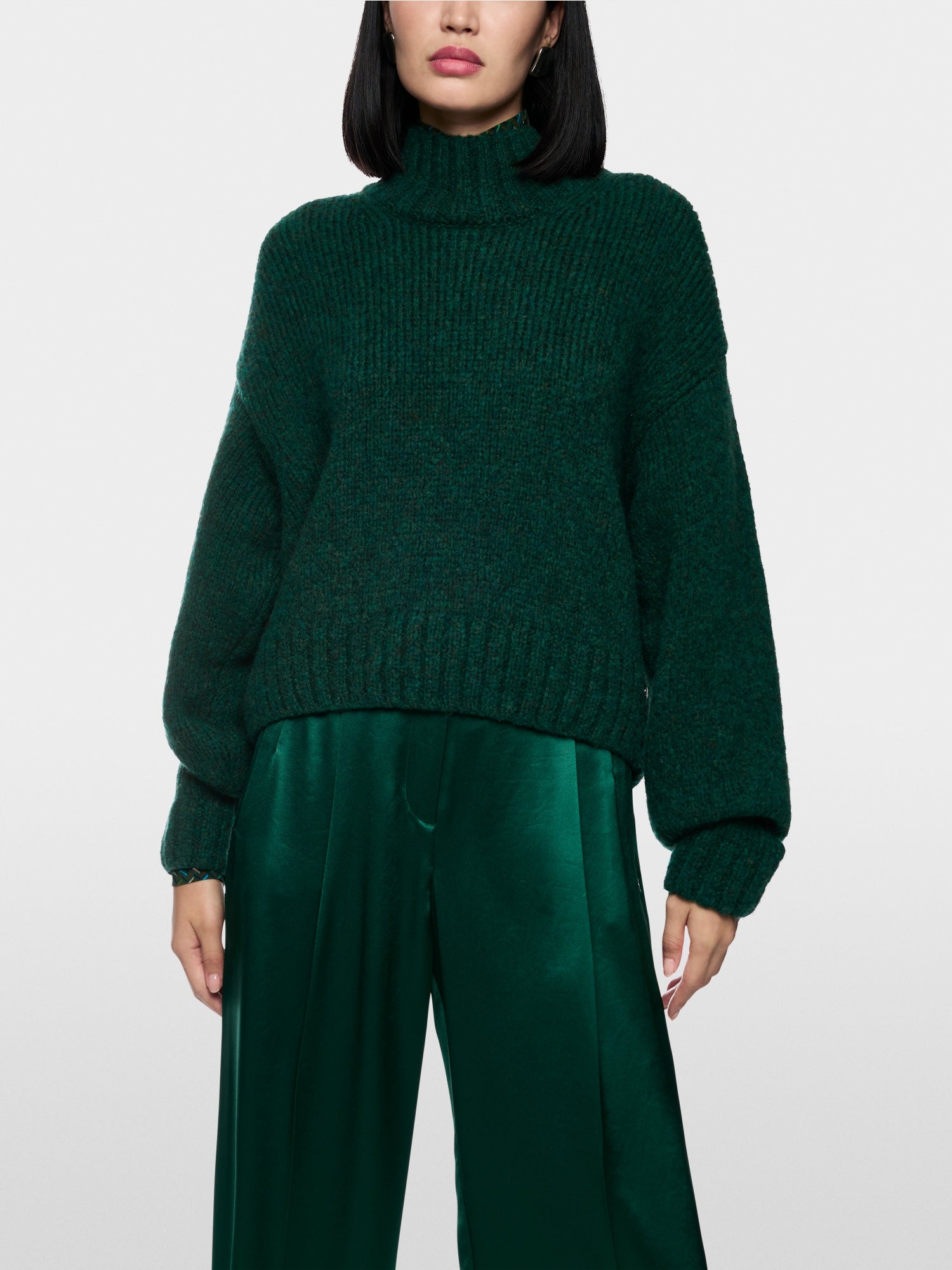 With its wide sleeves and a stand-up collar, this cosy jumper ensures ultimate comfort. Its alpaca content makes it particularly soft, while the raglan sleeves and loose, balloon-like cut ensure a modern fit. Perfect for cosy, stylish looks in the cold season. This jumper is knitted and finished in Germany. The individual parts are further processed at European partner companies. It is therefore Knitted in Germany.