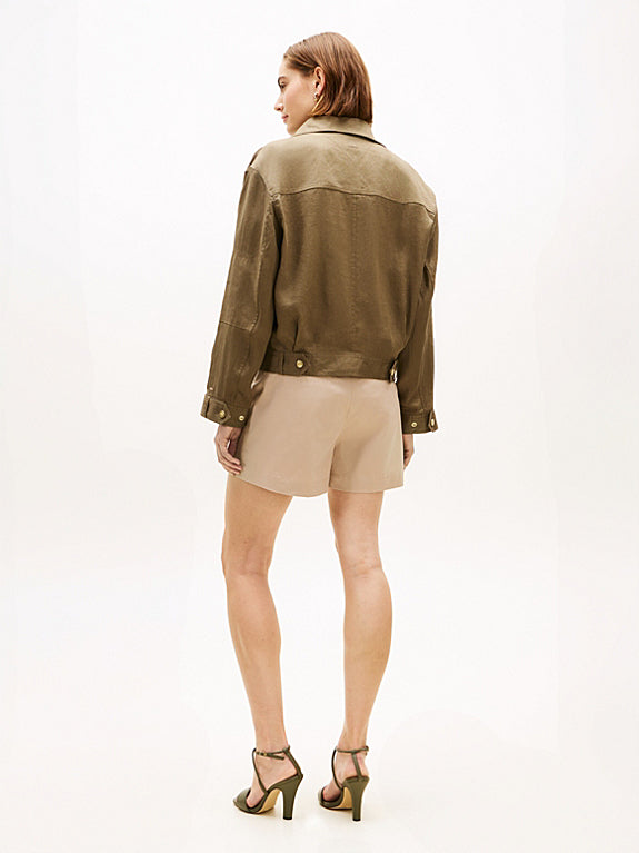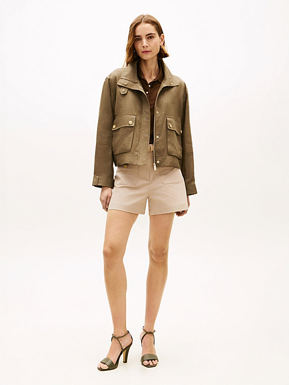 The Tommy Hilfiger Gold-Tone Button Pure Linen Utility Jacket is crafted from 100% linen, an inherently breathable fabric that offers comfort in various climates. The gold-tone buttons provide a sophisticated aesthetic while ensuring durability. This jacket is designed for functionality, making it suitable for both casual and semi-formal settings.