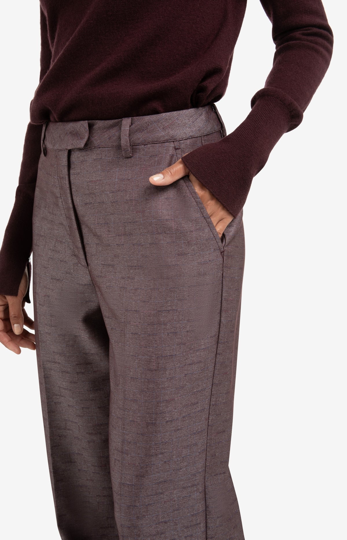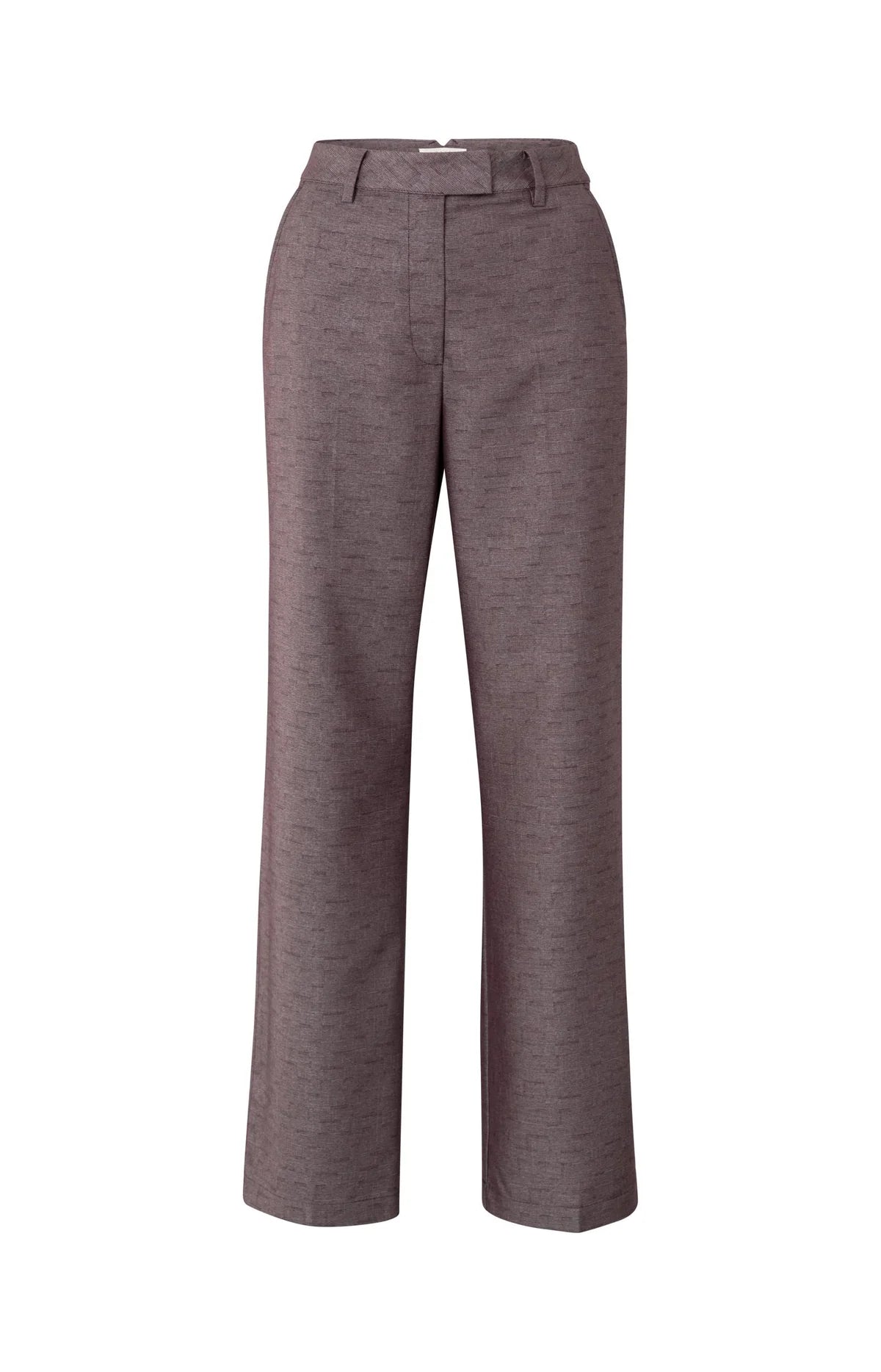 These stylish trousers are crafted from a shiny woven fabric and feature a high-rise waist with elegant front pleats. The wide legs offer a flattering silhouette, while the subtle sheen adds a touch of luxury. Finished with side pockets and belt loops. The model is 173 cm and wears size 36.