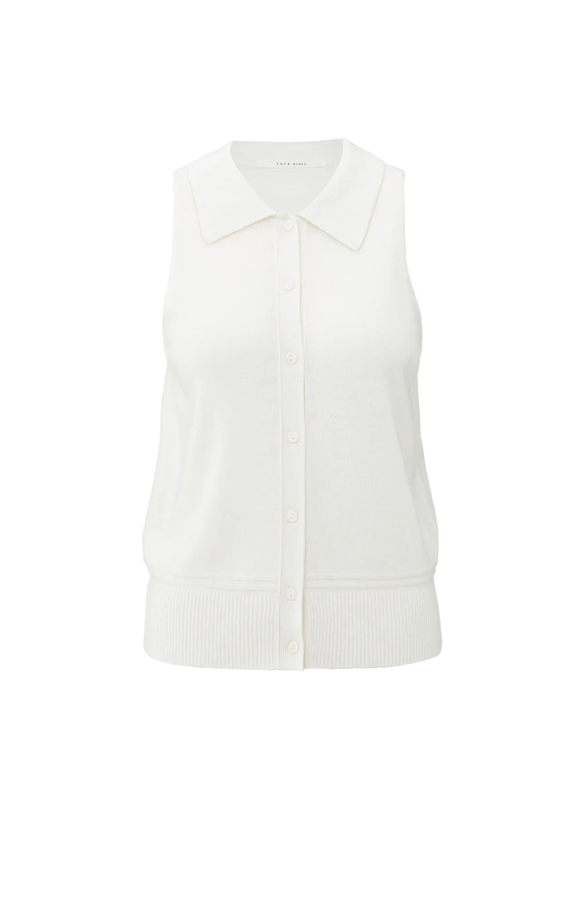 This sleeveless cardigan is made from a soft knit fabric and features a straight fit. Designed with a classic collar, full-length button closure, and ribbed hemline, its an elegant piece perfect for layering over a blouse or dress. The model is 178 cm and wears size S.