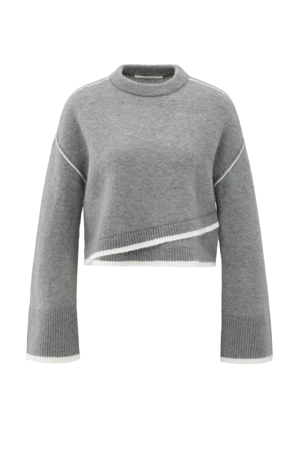This soft knitted sweater features a short, straight fit and subtle contrasting lines along the hem, cuffs, and shoulder seams. Designed with a round neckline and dropped shoulders, it has a relaxed feel, while the diagonal finish adds a playful touch. A modern piece that blends comfort with style. The model is 173 cm and wears size S.