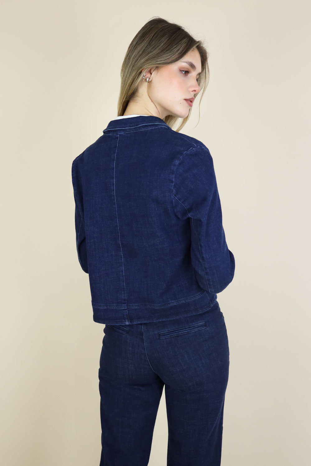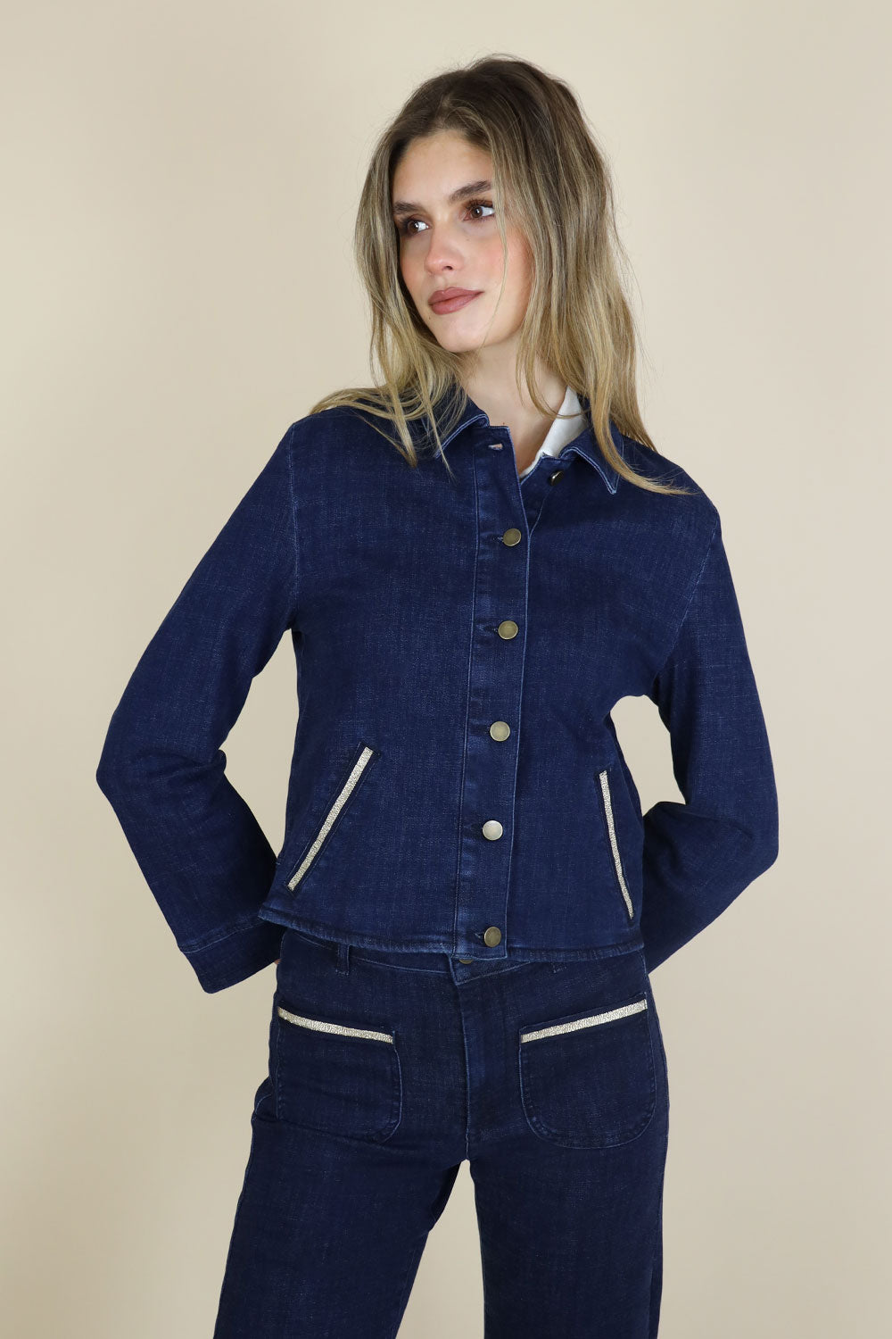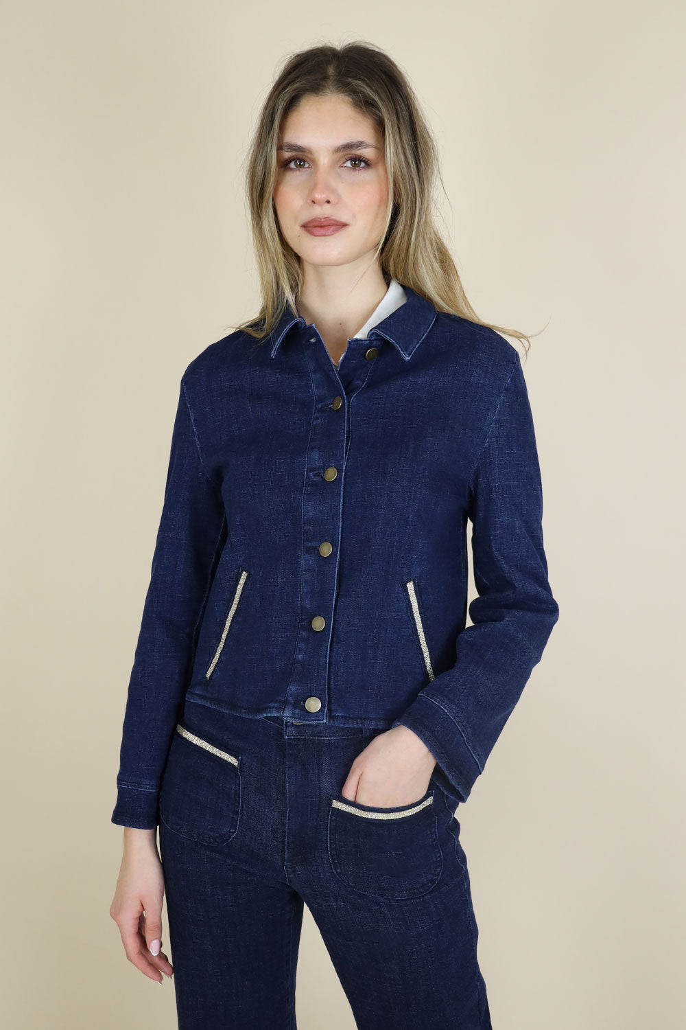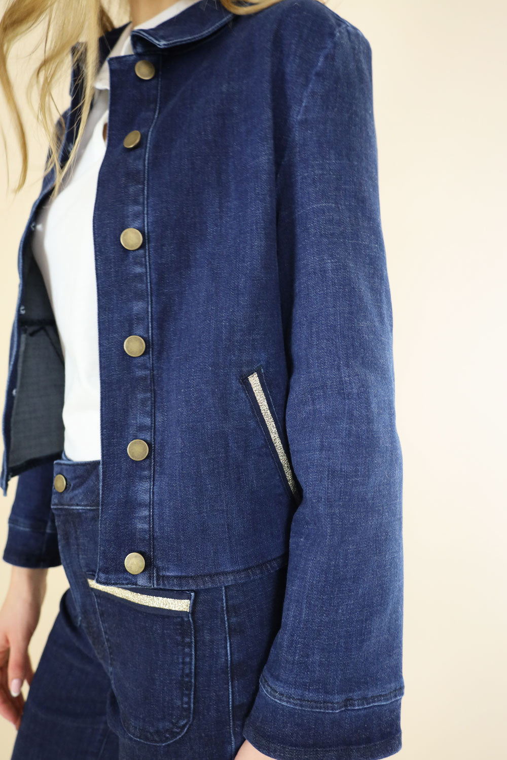The No2moro Alex denim jacket is crafted from a blend of cotton and elastane, providing both durability and stretch for enhanced comfort. The gold lurex trim adds a subtle touch of elegance, making this jacket suitable for various occasions while maintaining its classic denim appeal.