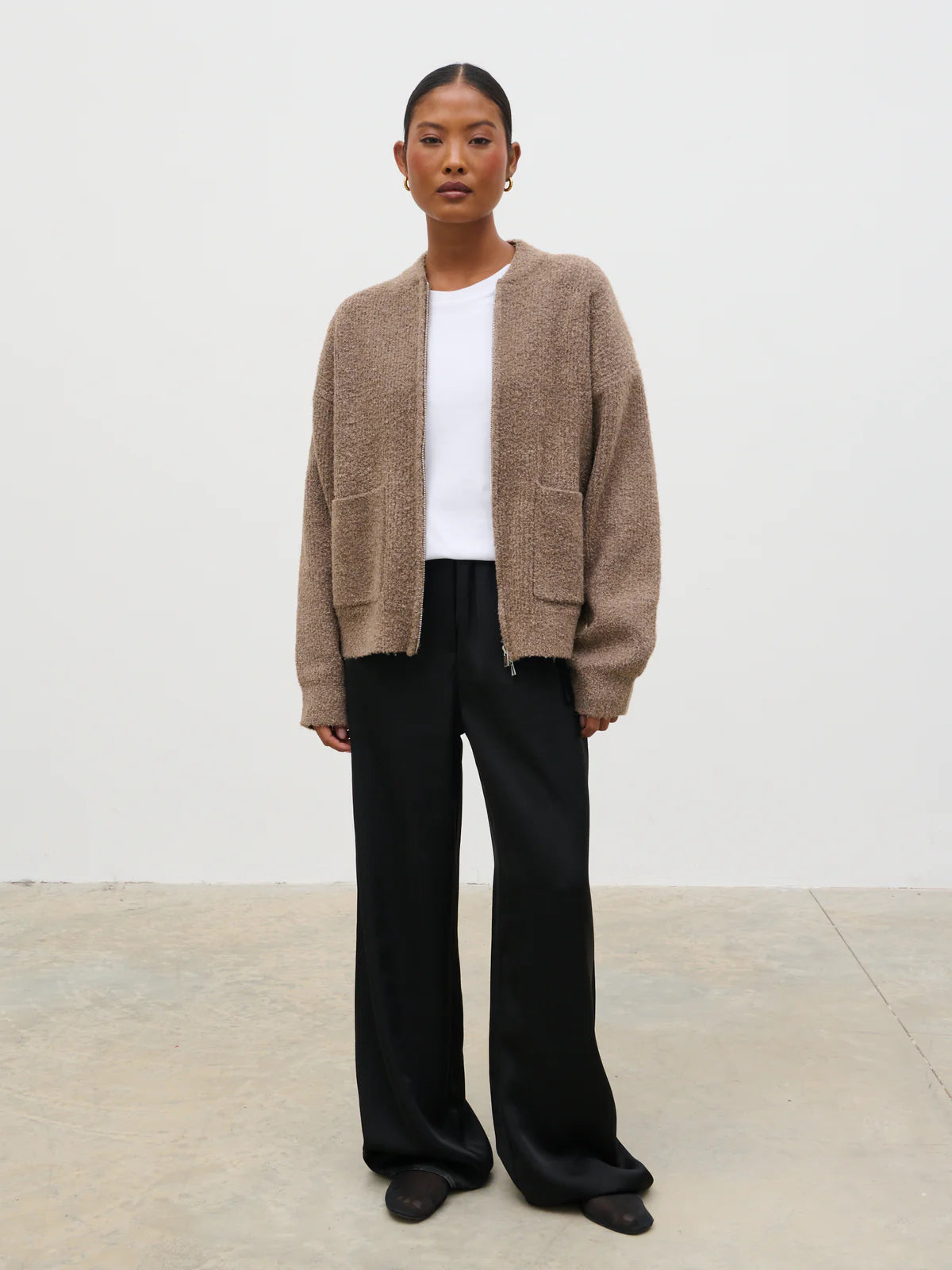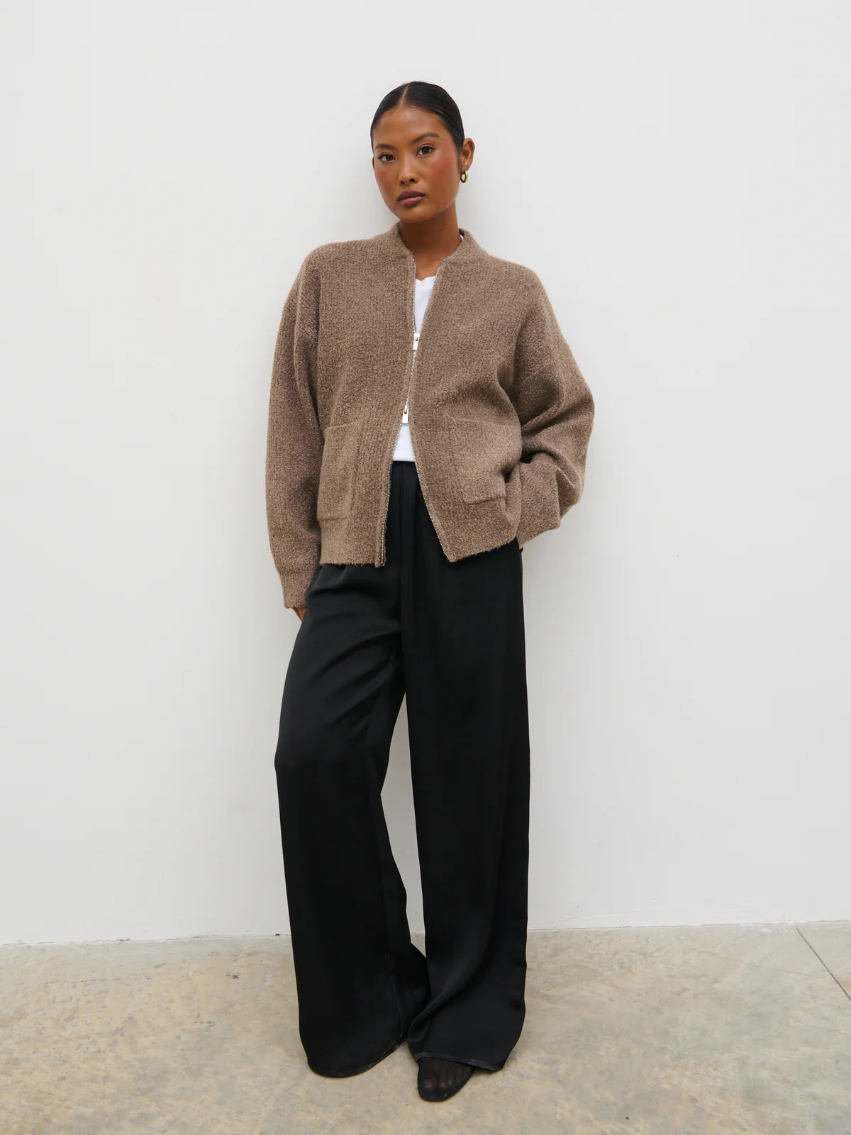 Expertly crafted with a bomber-style silhouette, the Prettylavish Camille Boucle Knit Bomber is the epitome of understated luxury. Made from a soft boucle yarn in a ribbed knit technique, this jacket offers both structure and comfort. Complete with front pockets and a double-ended zipper closure, it's the perfect combination of practicality and elegance.