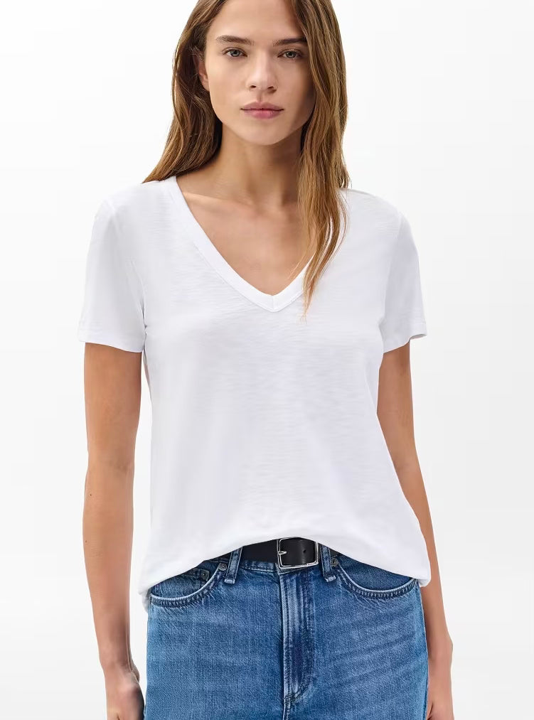 Crafted from 100% organic Peruvian slub cotton, the rag & bone white v-neck skin tee delivers a classic, tailored fit. The heathered look and subtle texture add a touch of sophistication to this essential t-shirt. Experience comfort and style with every wear.