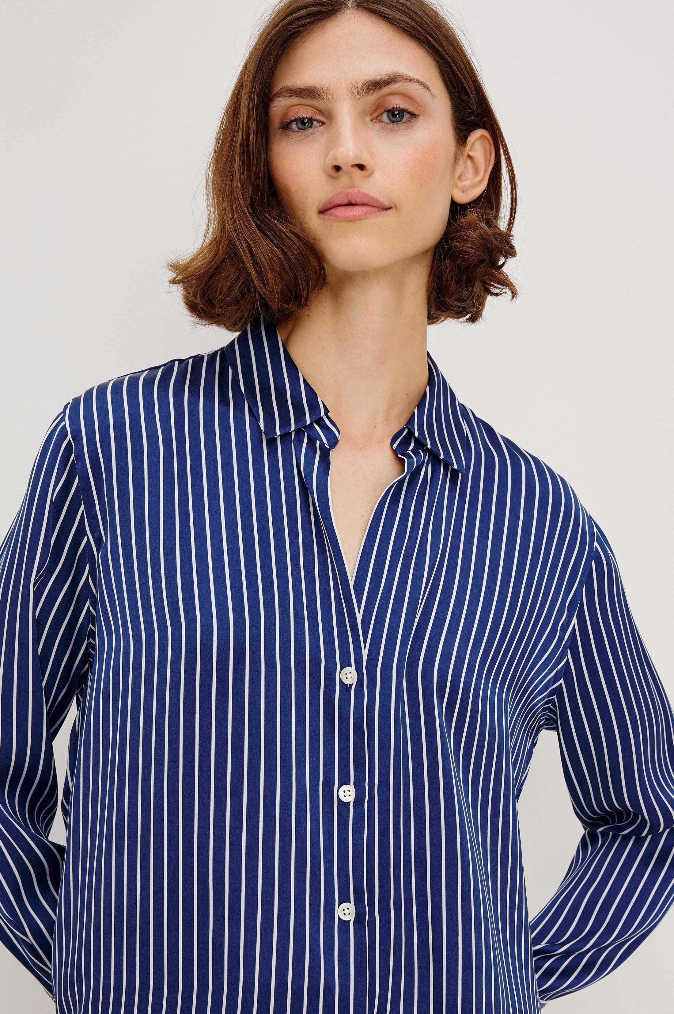 This classic striped shirt is ideal for any occasion, from work to the weekend and beyond. Made from silk charmeuse, it's reminiscent of wearing luxe silk pajamas in public. The best part is, it's designed to be styled in a plethora of ways, making it a tried-and-true staple in your closet.
