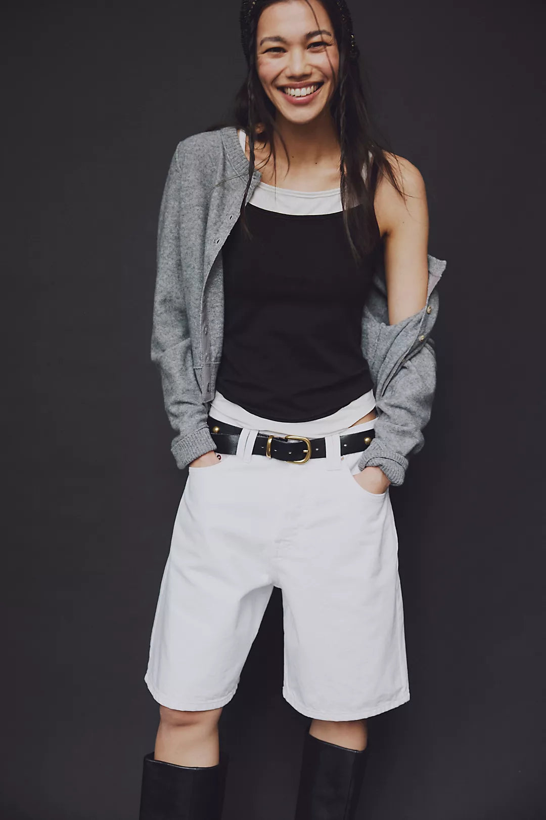 The Free People Montana Denim Shorts in white denim offer a mid-rise, relaxed bermuda fit that balances comfort with style. Featuring a button-fly closure and five-pocket design, these shorts are crafted from authentic rigid denim, ensuring durability and a structured silhouette. Ideal for versatile summer wear.