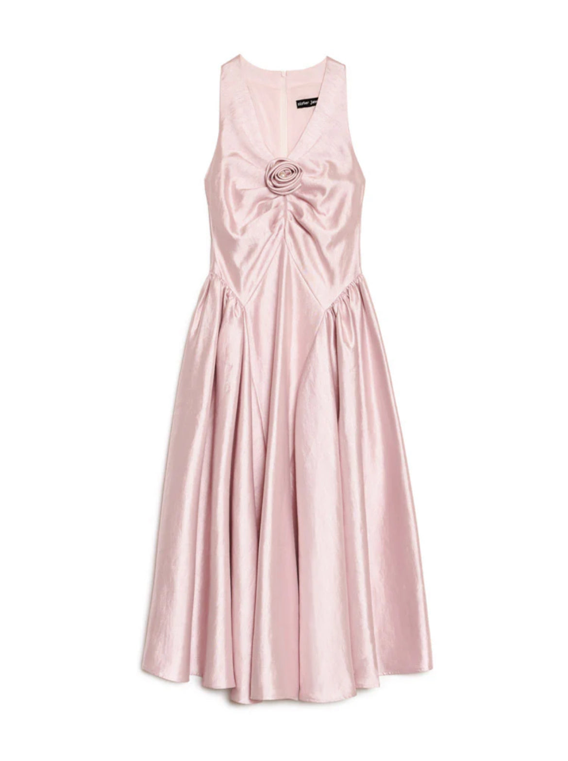 Midi length dress in a structured taffeta fabric. Detailed with a matching rose trim with pearl centre. Featuring bodice gathering and curved seams at the hips. Fully lined and fastened with a concealed zip.