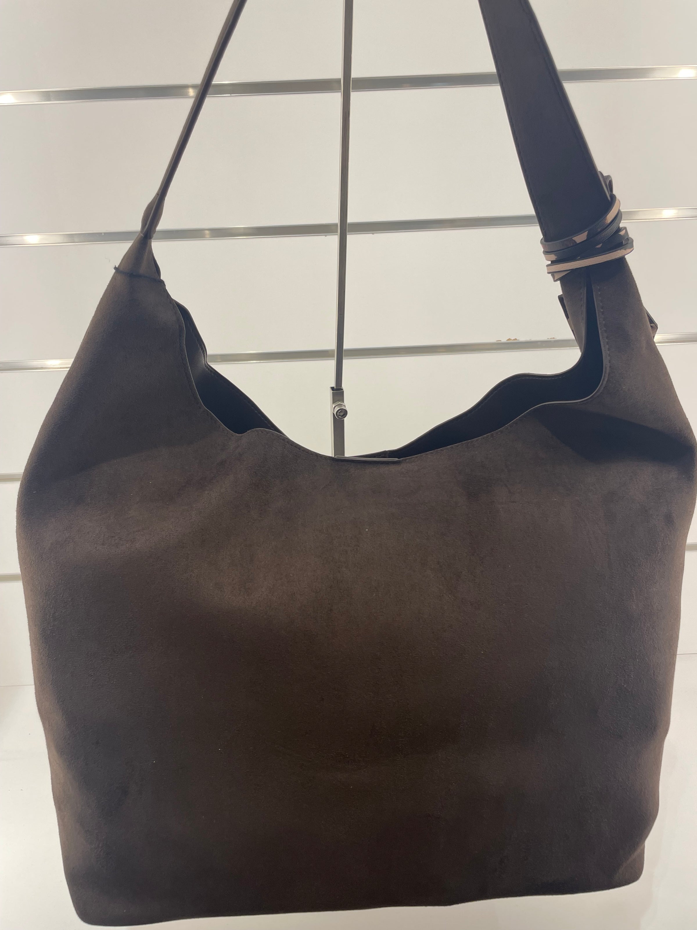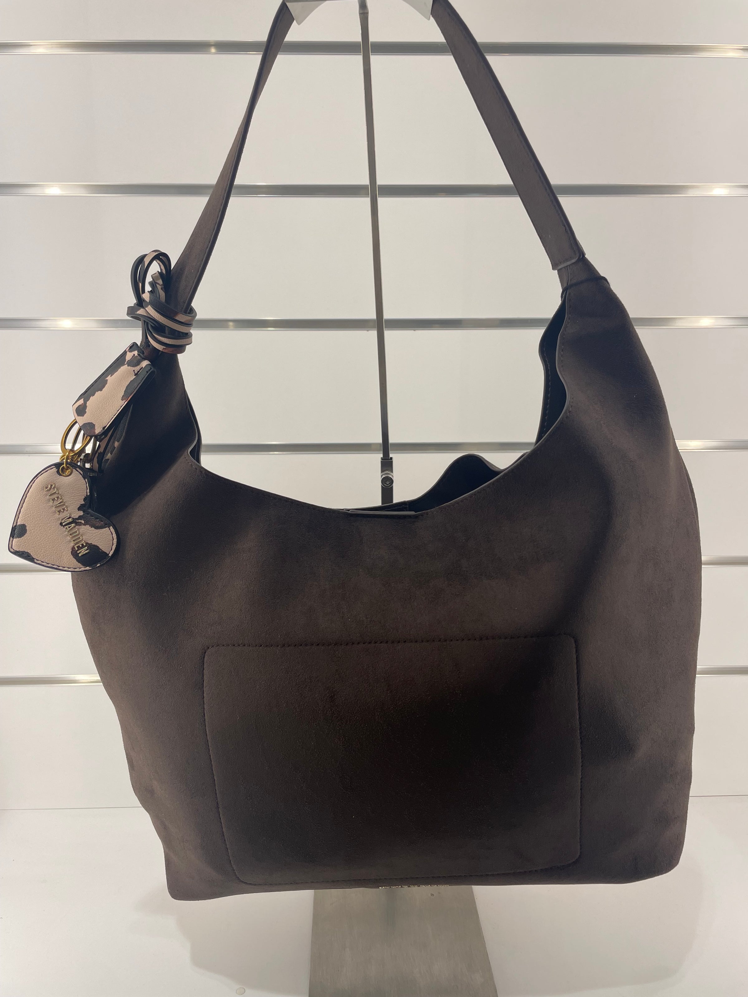 Introducing the must-have statement bag of the season: The Steve Madden Blenore bag in rich chocolate suede. This stylish handbag is perfect for everyday use, providing both functionality and fashion-forward design. Upgrade your daily wardrobe with this on-trend accessory.