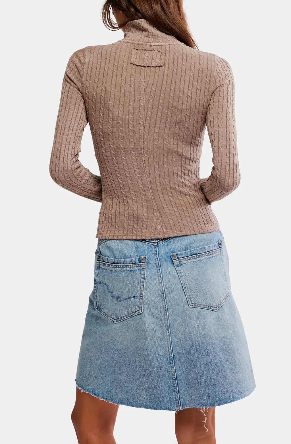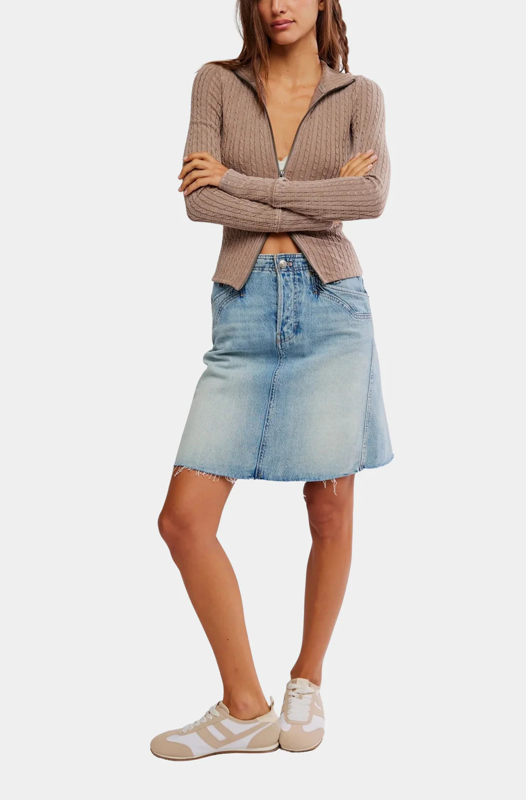 The Brunch Girl Zip-Up is a slim-fit sweater with a modern two-way zipper and a subtle cable knit pattern. Its lightweight design and long sleeves make it easy to layer or wear alone