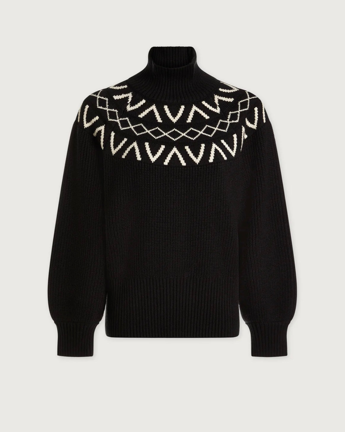 This piece boasts a relaxed fit, turtleneck, and chic balloon sleeves, complemented by an intricate all-over ribbed design and contemporary V monogram Fair Isle yoke. Complete the look by pairing the sweater with our matching beanie for an effortlessly stylish ensemble.