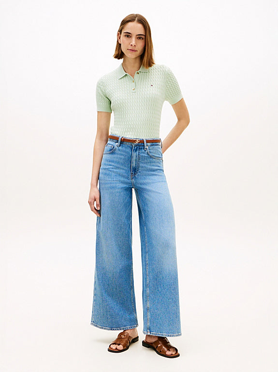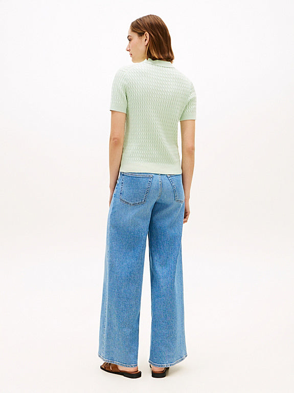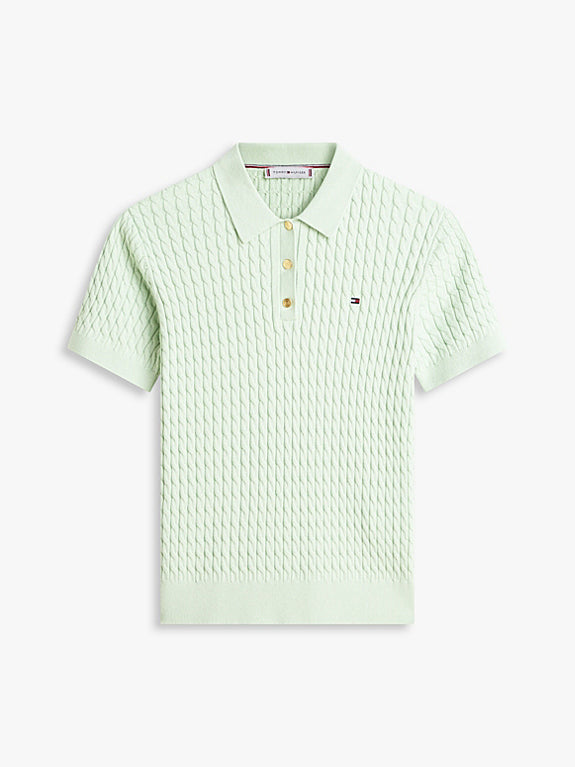 This polo jumper features a fine-gauge cable knit and a soft collar, infusing it with timeless elegance while maintaining a laid-back aesthetic.