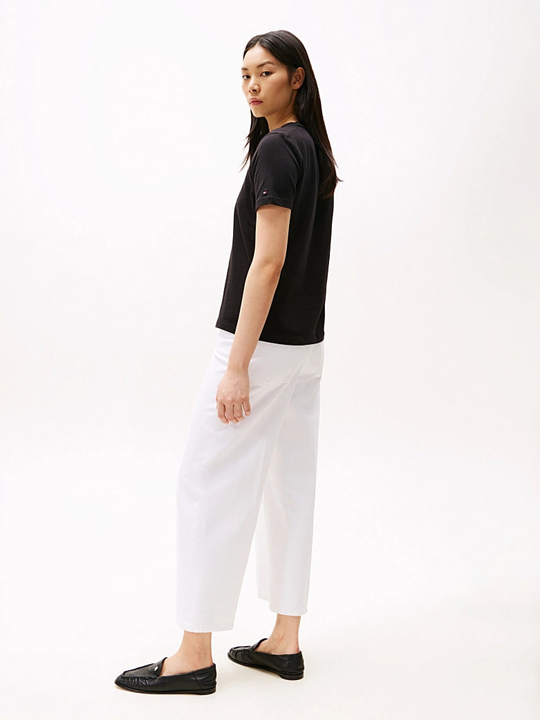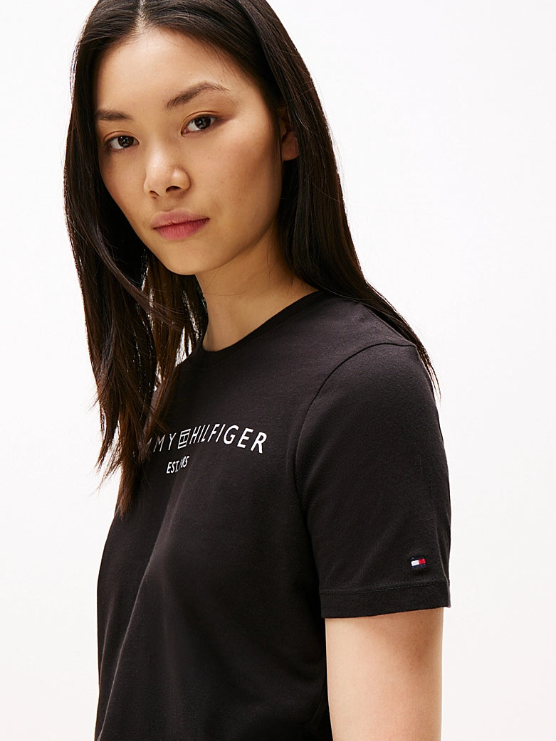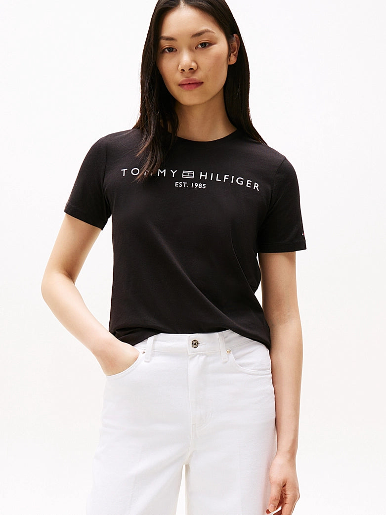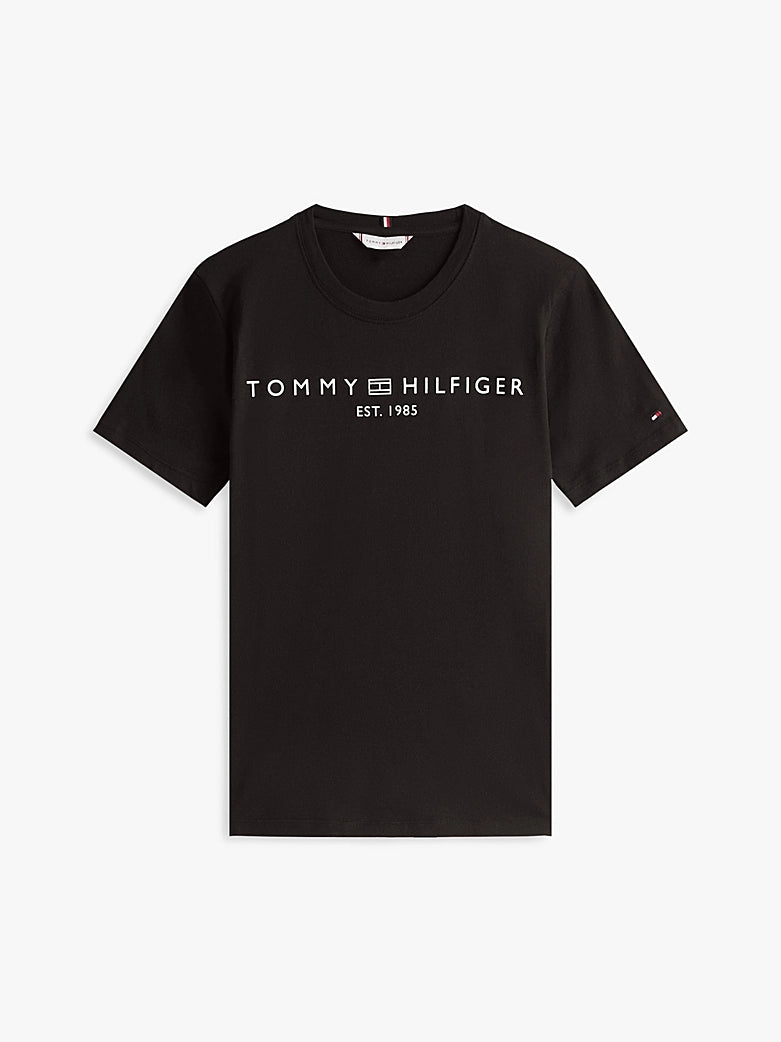 'Elevate your casual style with the Tommy Hilfiger logo tee in black. Made with soft cotton jersey, this must-have T-shirt features a crew neck, signature tape at the neckline, and the iconic Tommy Hilfiger logo on the chest. With a regular fit and timeless design, it's perfect for any weekend occasion.