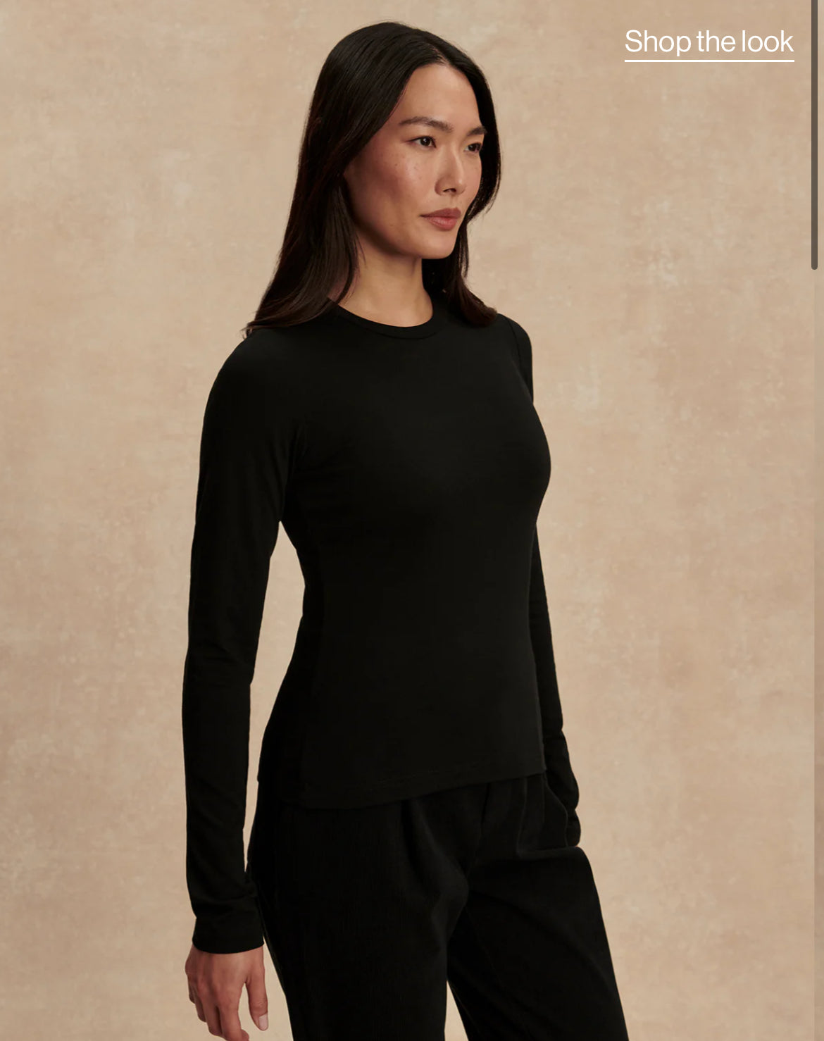 This fitted longsleeve tee is the perfect base layer to wear underneath a jacket or vest, but works just as well when worn solo. Crafted from Soft Modal Jersey, it has a super soft texture and offers breathability, ideal for everyday layering. It is cut to a slim, slightly cropped shape inspired by the Regina tee, featuring a close-fitting crew neck, flattering shaping at the waist, and set-in sleeves.