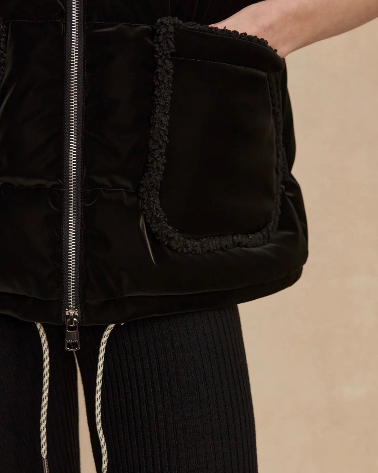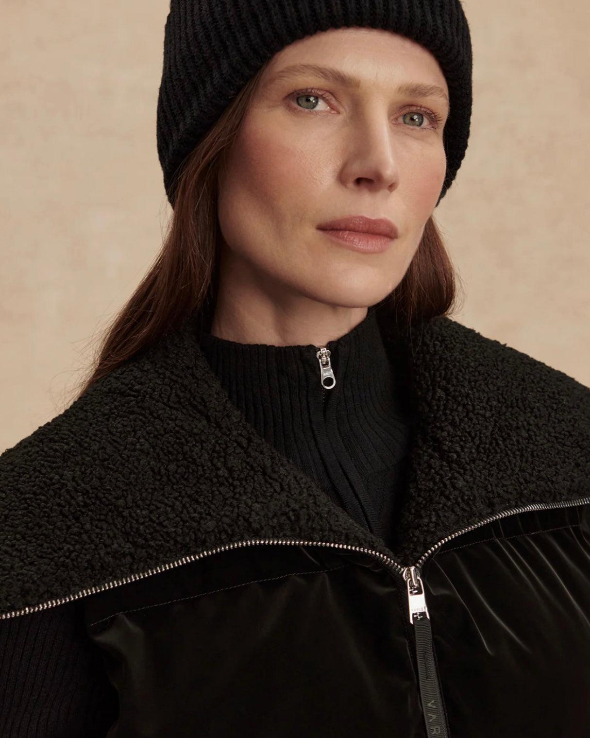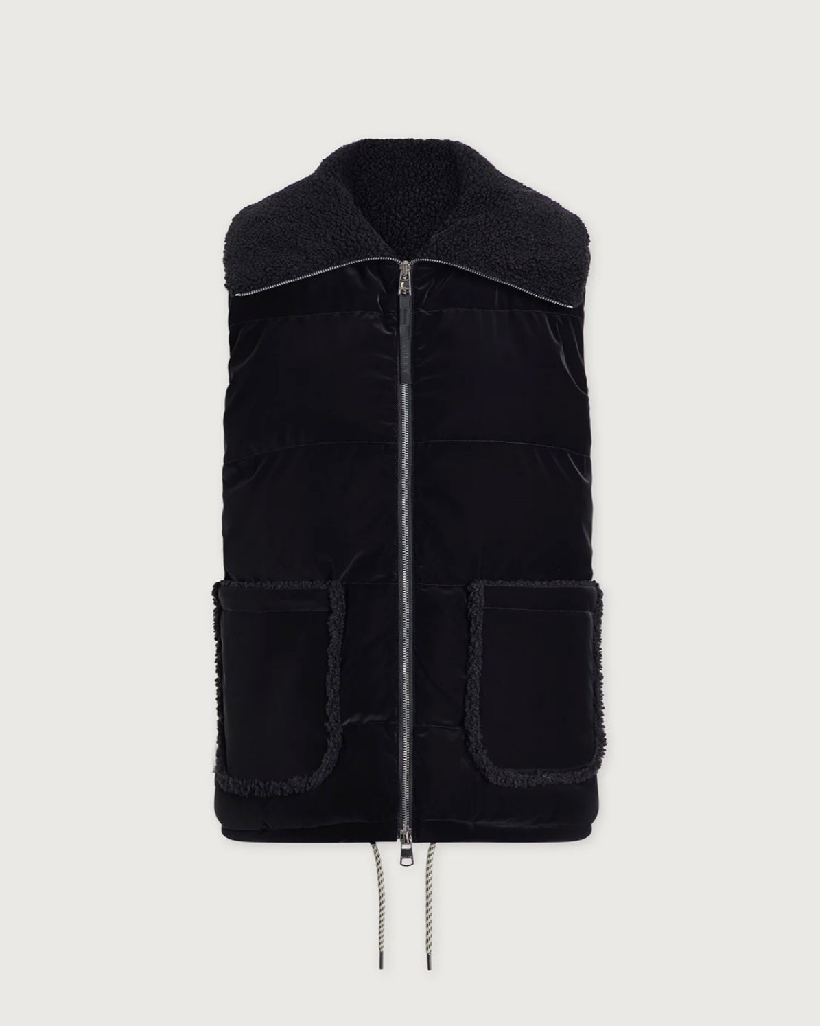 Crafted from a luxurious Nubuck PU, the Evie gilet blends outerwear quality with a super soft handfeel and a velvet sheen. Perfect for easy layering over knits and sweats, it features an elegantly oversized collar, Bouclé Sherpa trimmed pockets, and a double-ended zip. An adjustable hem lets you customize your style.