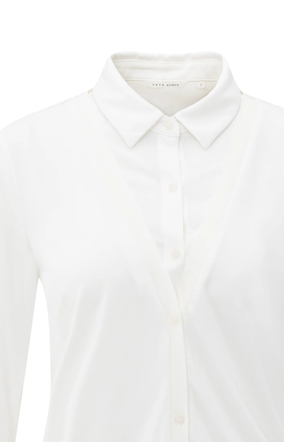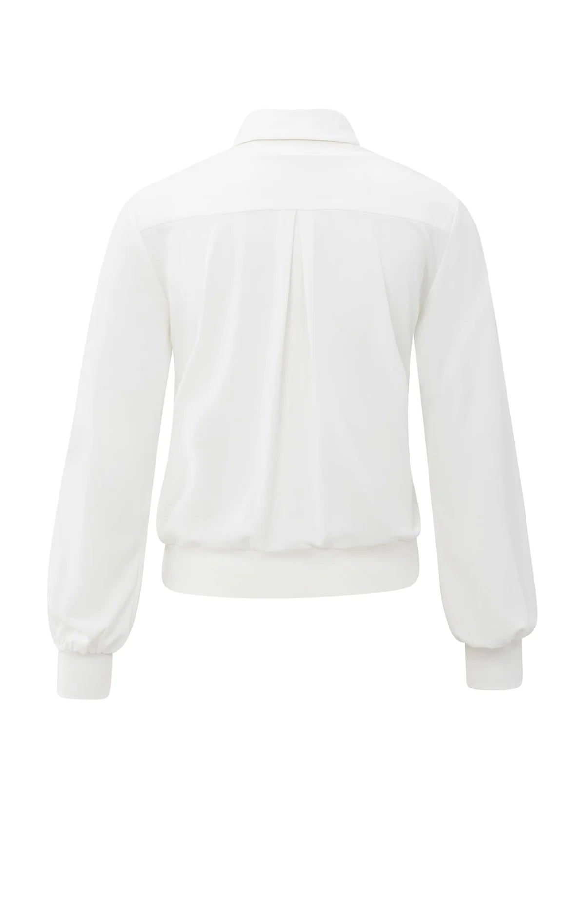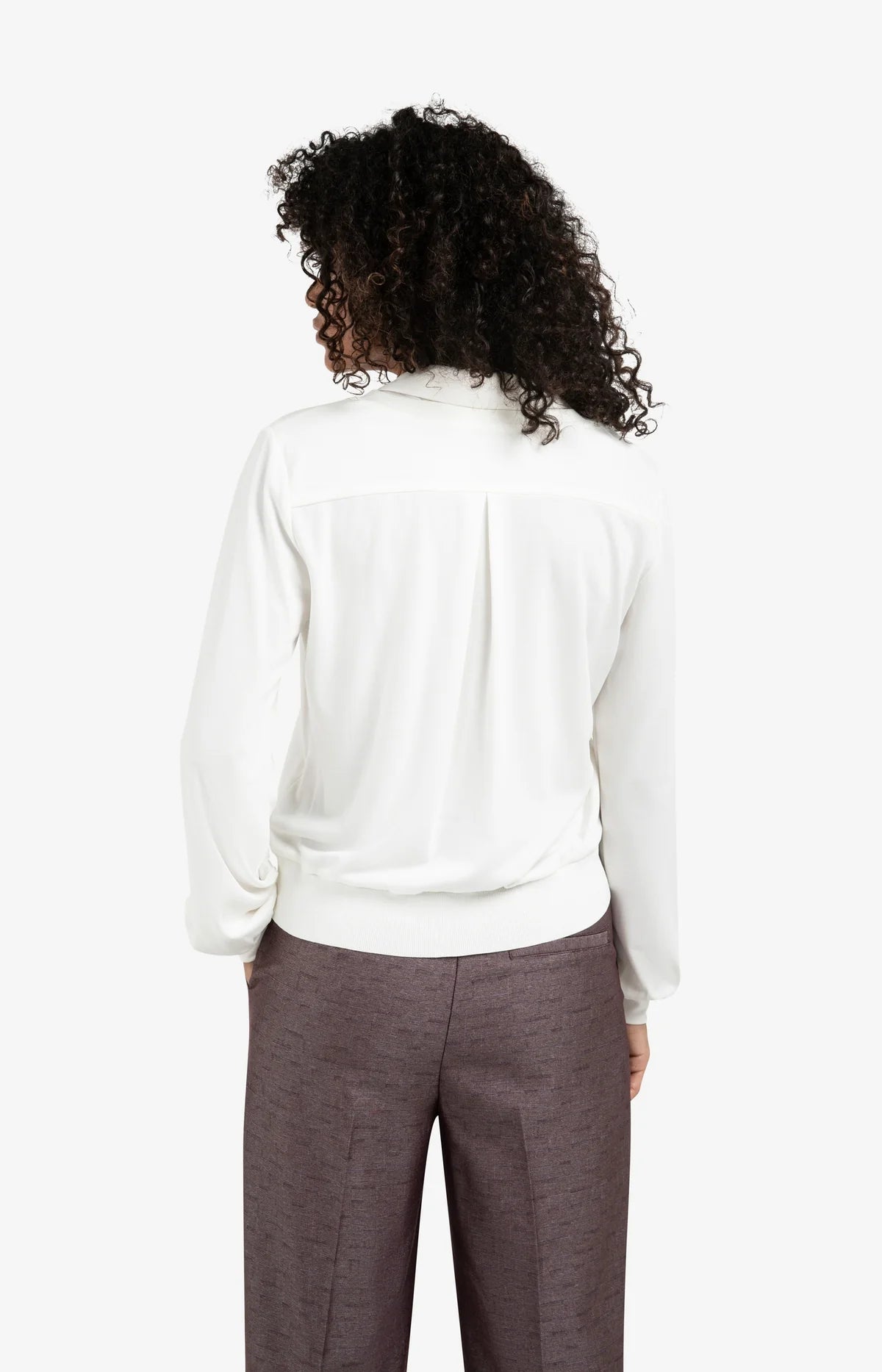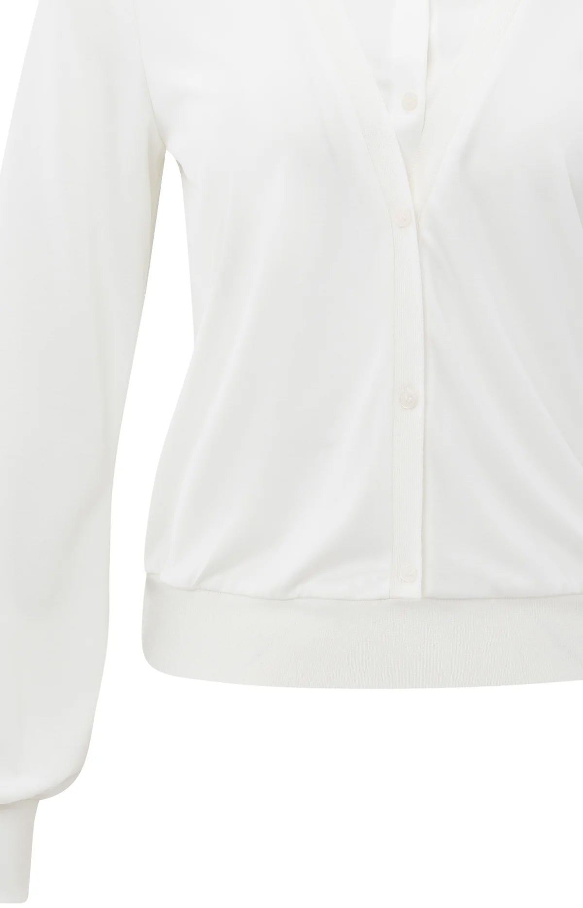 This stylish jersey blouse features a soft shirt collar, long balloon sleeves, and a button-down front. The design includes a double layer effect that creates the illusion of a layered cardigan over a blouse. Finished with ribbed cuffs and hem for a comfortable fit. A refined piece that adds depth and character to your look. The model is 173 cm and wears size S.