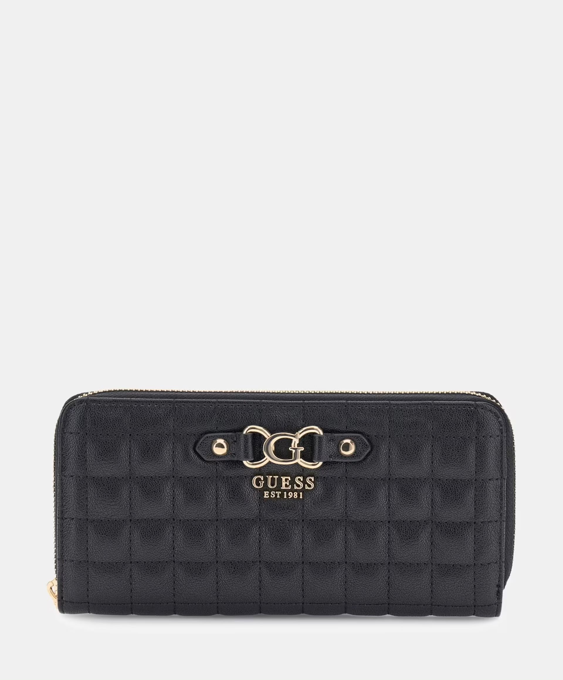 The Guess Nadia Wallet is a stylish and functional accessory from the Nadira collection. Crafted from high-quality faux leather, it features a zip closure, pale gold hardware, and a main compartment with an internal coin purse and credit card slots. The back zip pocket and logo script with metal detailing add a touch of elegance.