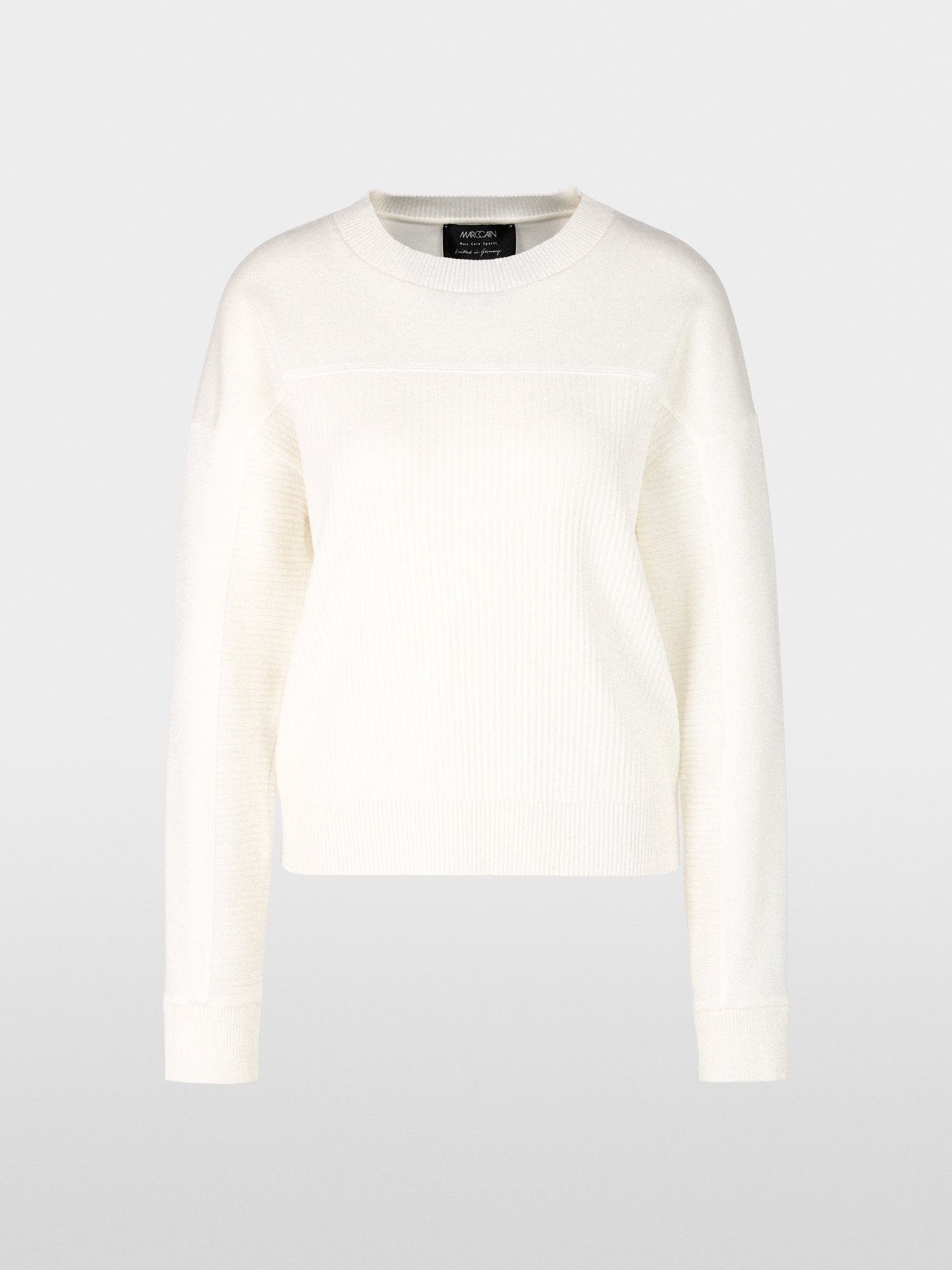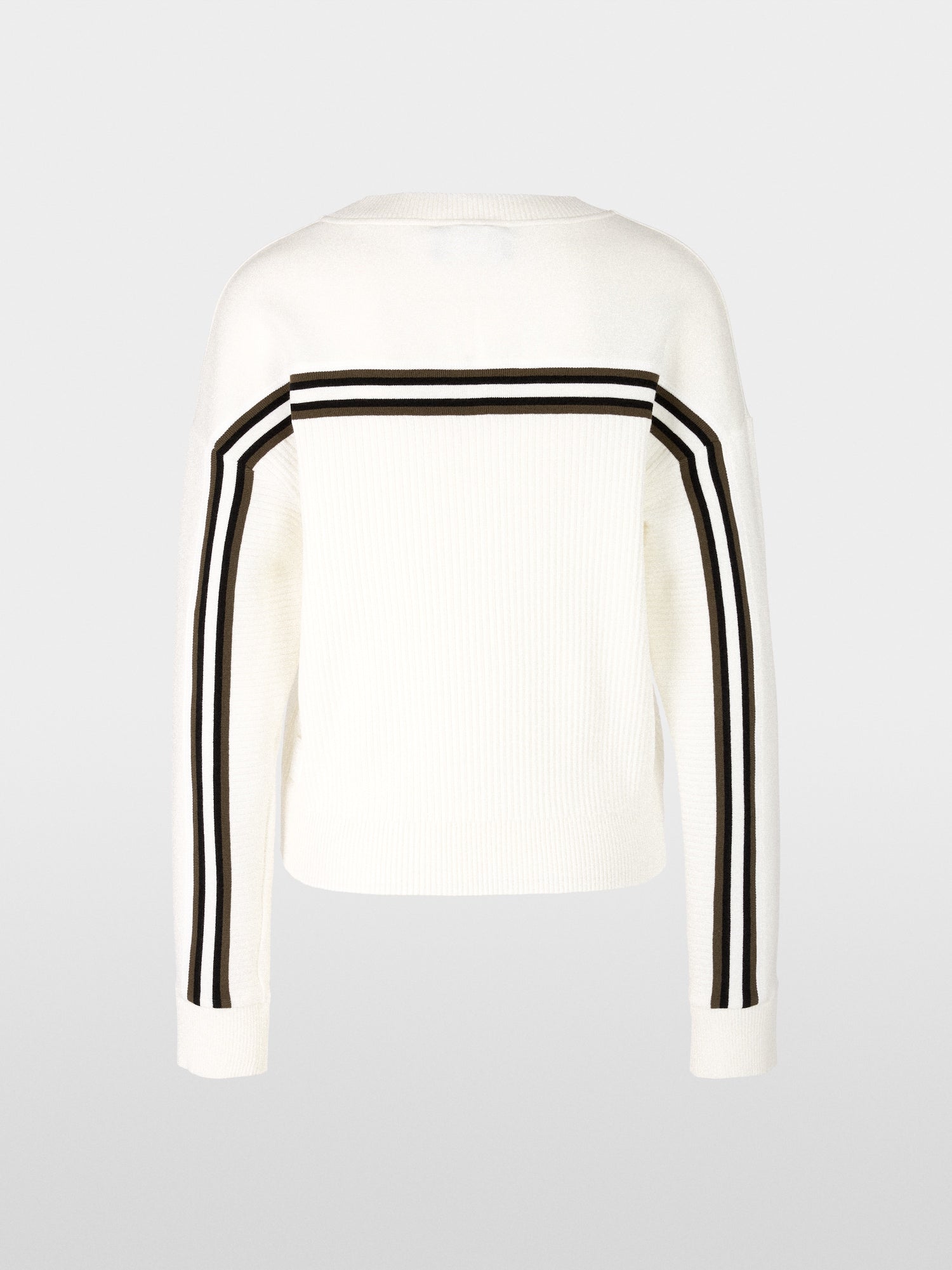 Casual jumper with long sleeves and a round neck. This garment is moderately wide and pretty sporty. The design of the back is particularly striking with its striped pattern that runs from the back down the sleeves. This jumper Knitted in Germany: it is knitted and finished in Germany, while the individual parts such as the sleeves and front are sewn together in European partner companies.