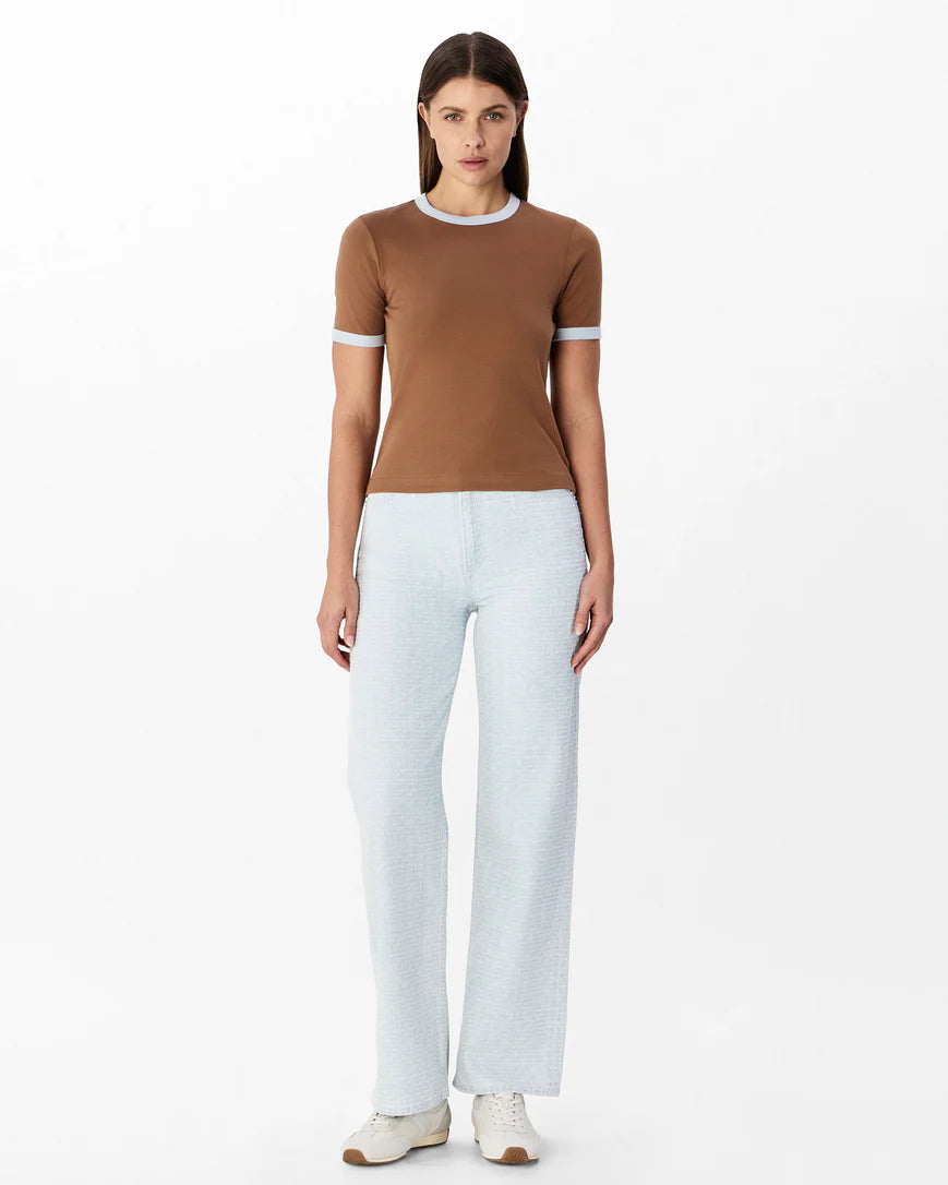This Rag & Bone classic tee features a brown design with blue trimming, perfect for a timeless and versatile look. Made with high-quality materials, this tee offers both style and comfort for everyday wear. Add it to your wardrobe for effortless yet chic style.