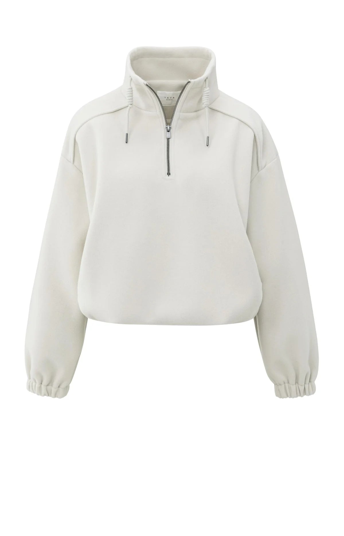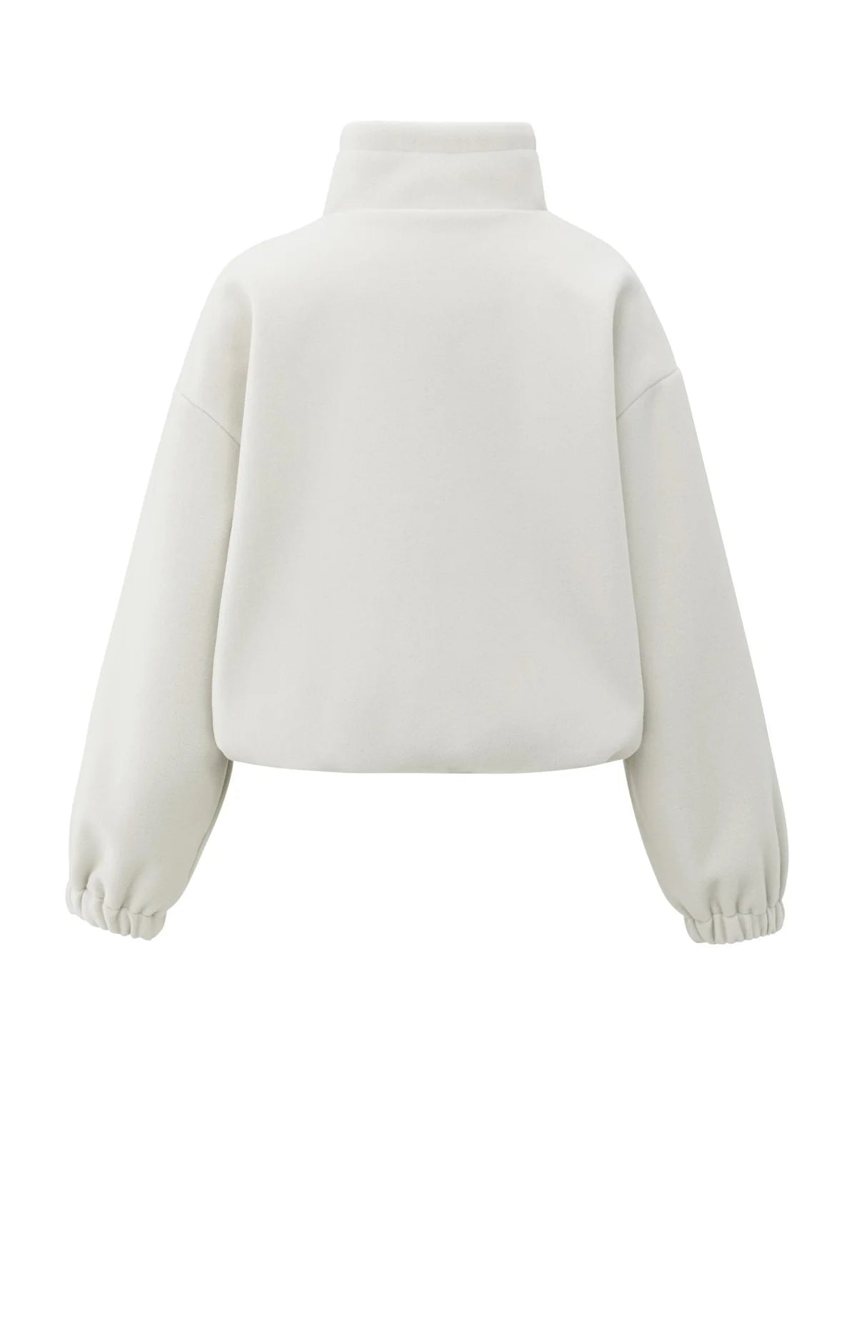 This soft sweatshirt features voluminous balloon sleeves for a modern, feminine silhouette. The high zip collar with subtle drawstring details adds a sporty touch. Finished with elastic trims for comfort and style. Perfect for a relaxed yet elevated look. The model is 178 cm and wears size S.